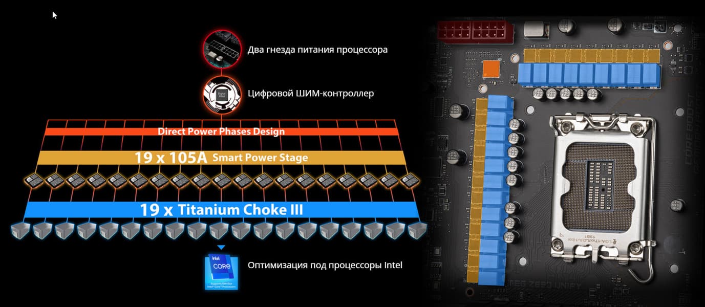 Управляет схемой питания VCore и iGPU ШИМ-контроллер RAA229131 от того же Renesas, рассчитанный максимум на 20 фаз.