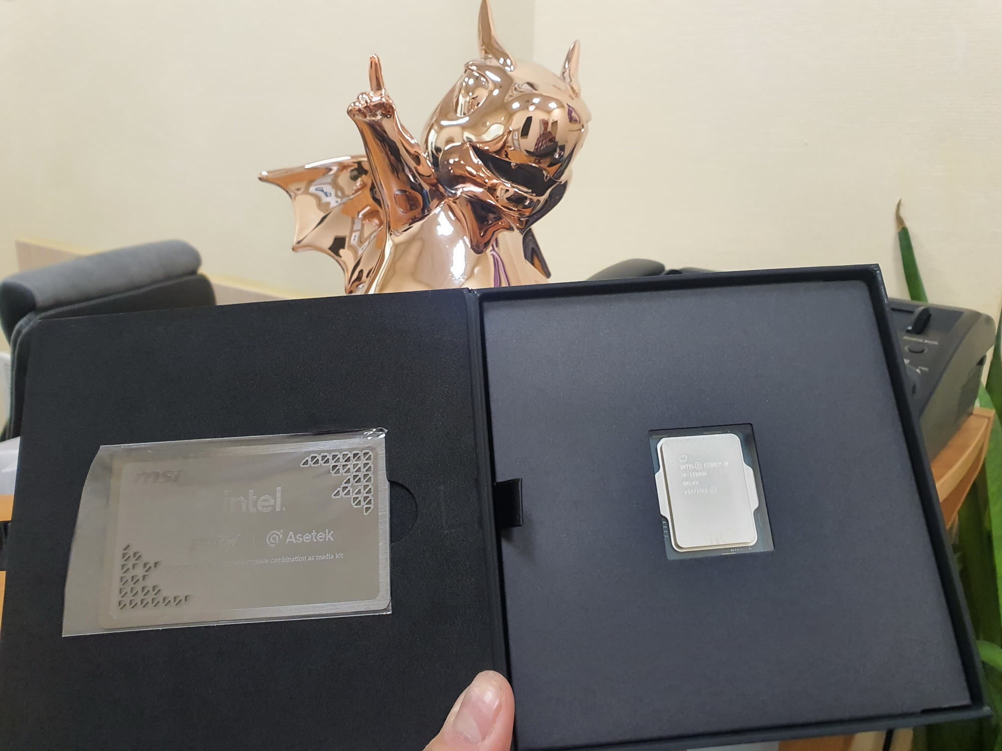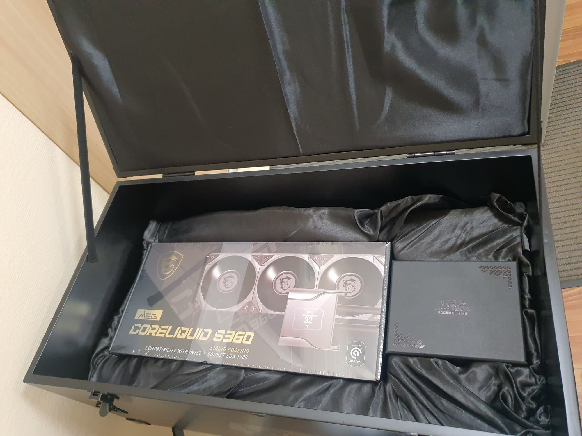 «Нижним» этажом идет не менее волшебно упакованная система жидкостного (водяного) охлаждения MSI MEG CoreLiquid S360, а в коробочке справа — дополнительные элементы дизайна для экрана на помпе этой СЖО. Да, с учетом того, что предыдущие СО могут оказаться несовместимыми с LGA1700, в компании MSI позаботились о полноценном тестировании своей матплаты. Разумеется, сам герой дня — процессор Core i9-12900K упакован не менее роскошно в отдельную премиальную коробку.