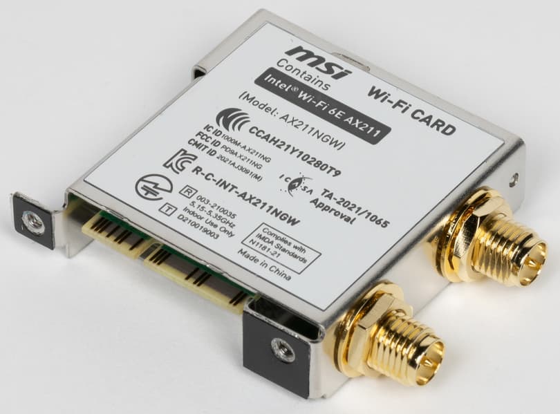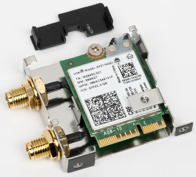 Имеется и комплексный беспроводной адаптер на контроллере Intel AX-211NGW, через который реализованы Wi-Fi 6E (802.11a/b/g/n/ac/ax) и Bluetooth 5.2. Он установлен в слот M.2 (E-key), и его разъемы для привинчивания выносных антенн выведены на заднюю панель.