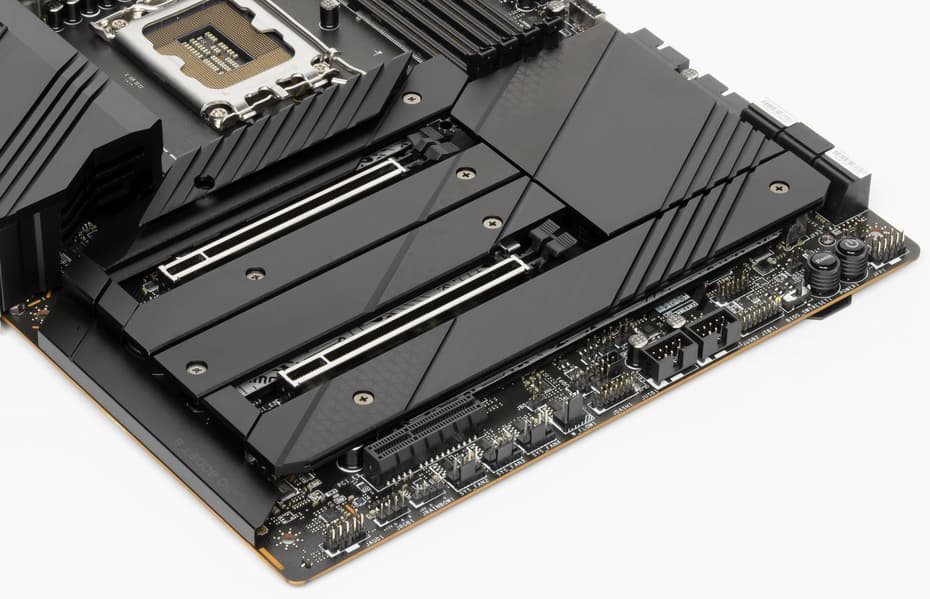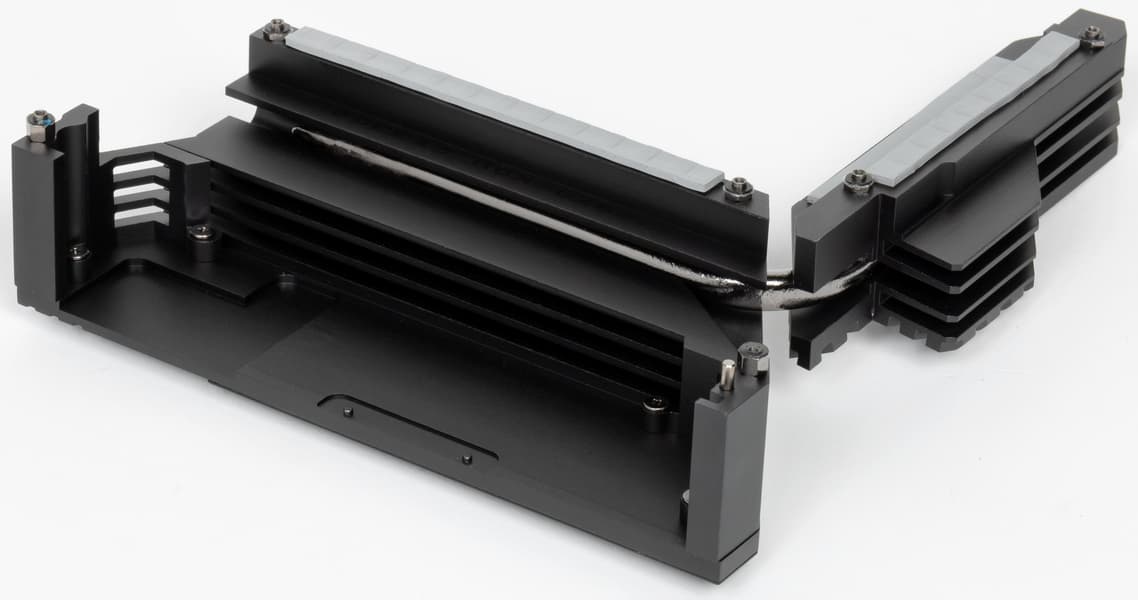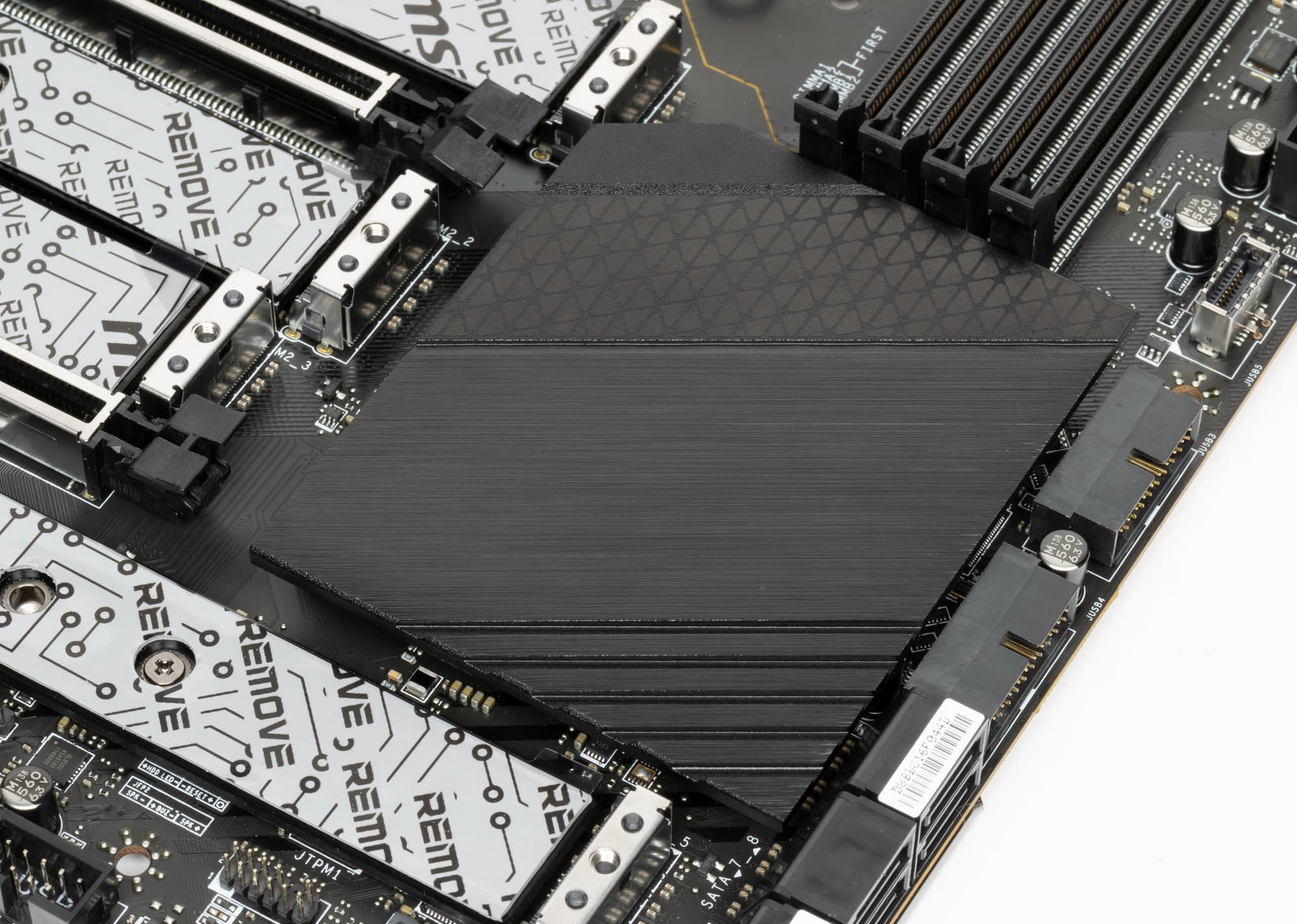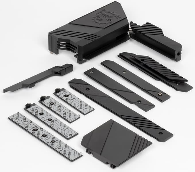Все M.2 слоты имеют радиаторы. M.2_1/М.2_2/М.2_3 обладают отдельными радиаторами, когда как остальные слоты M.2_4/М.2_5 имеют общий радиатор.