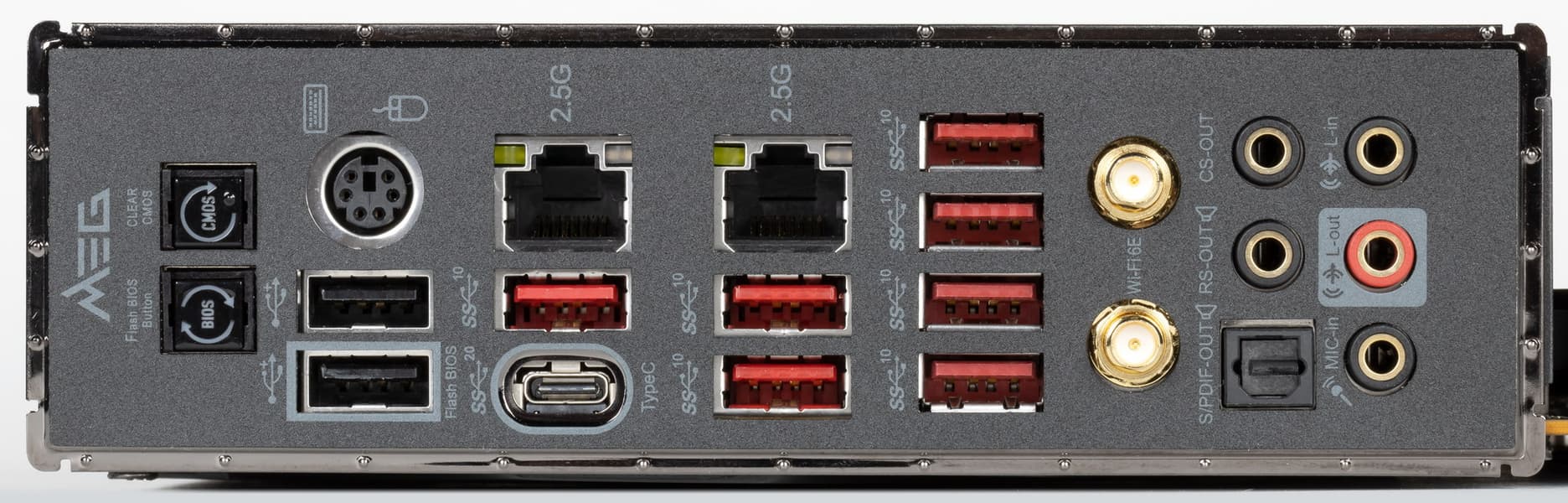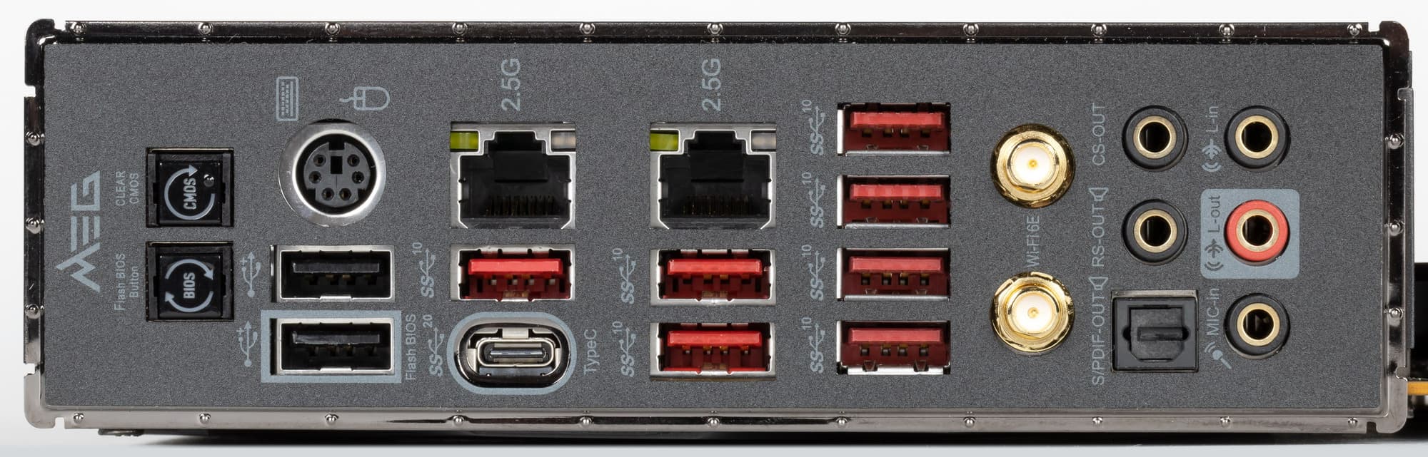 | Разъемы на задней панели | 1 × USB 3.2 Gen2x2 (Type-C) 7 × USB 3.2 Gen2 (Type-A) 2 × USB 2.0 (Type-A) 2 × RJ-45 5 аудиоразъемов типа миниджек 1 разъем S/PDIF 2 антенных разъема 1 универсальный разъем PS/2 кнопка сброса CMOS кнопка перепрошивки BIOS — Flash BIOS |