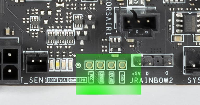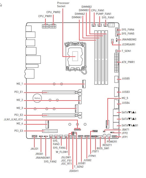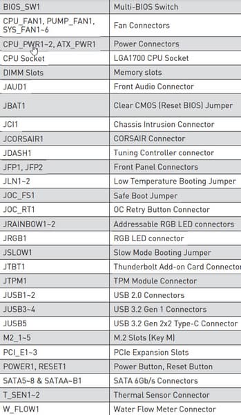 | Прочие внутренние элементы | 24-контактный разъем питания ATX 2 8-контактный разъем питания EPS12V 1 слот M.2 (E-key), занят адаптером беспроводных сетей 1 разъем для подключения порта USB 3.2 Gen2×2 Type-C 2 разъемa для подключения 4 портов USB 3.2 Gen1 2 разъема 4 портов USB 2.0 8 разъемов для подключения 4-контактных вентиляторов и помп ЖСО 4 разъема для подключения адаптеров подсветки (1 разъем неадресуемой RGB-ленты, 2 разъема адресуемой ARGB-ленты и 1 разъем для устройств Corsair) 1 разъем для дискретной карты Intel Thunderbolt 1 разъем для TPM 1 разъем для подключения адаптера управления с передней панели корпуса 1 разъем для Tuning Controller 3 разъема для настроек оверклокинга 1 переключатель версий BIOS 2 кнопки: питания и перезагрузки |