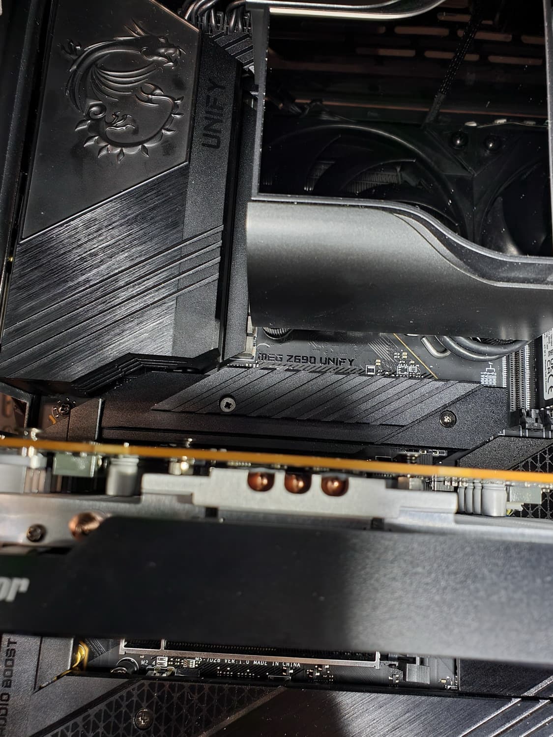 Всего на плате есть 3 слота: два PCIe x16 (для видеокарт или других устройств) и один PCIe x4. Если про первые два PCIe x16 я выше уже рассказал (они подключены к CPU), то PCIe x4 подключен к Z690 и работающий в режиме х4.