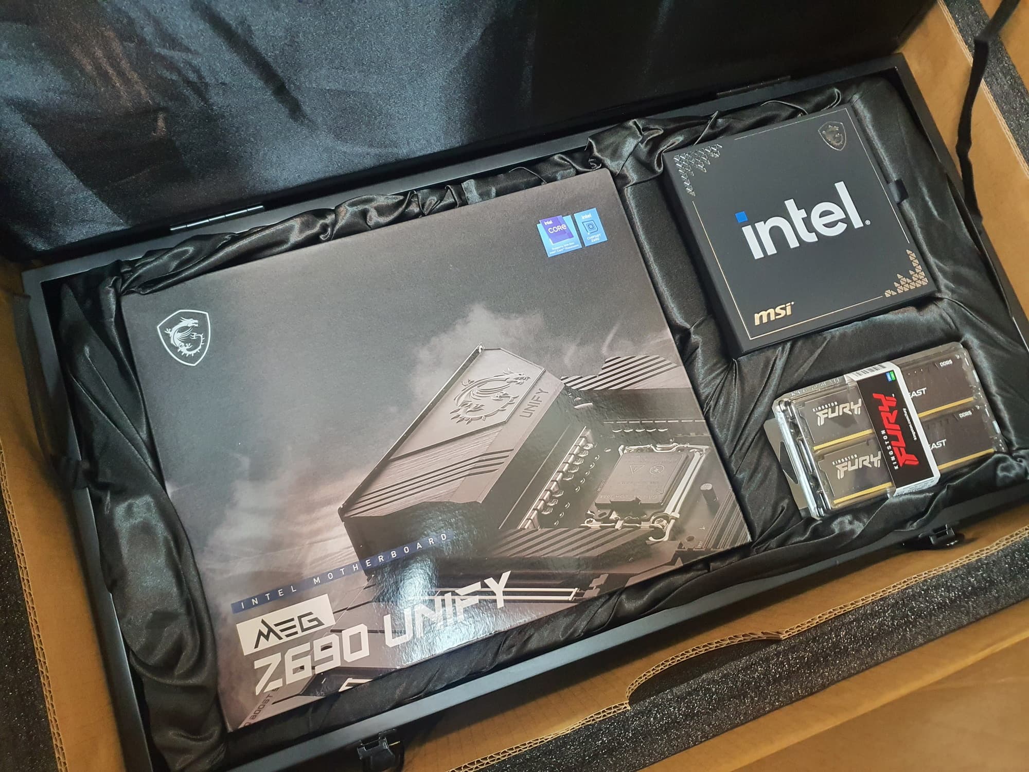 Комплект нежно упакован в шелк на манер боевых наград за мужество нахождения памяти DDR5 (которую на момент написания материала найти в продаже было вообще невозможно). Казалось бы, зачем для матплаты, процессора и набора памяти такой глубокий ящик? — А вот зачем.