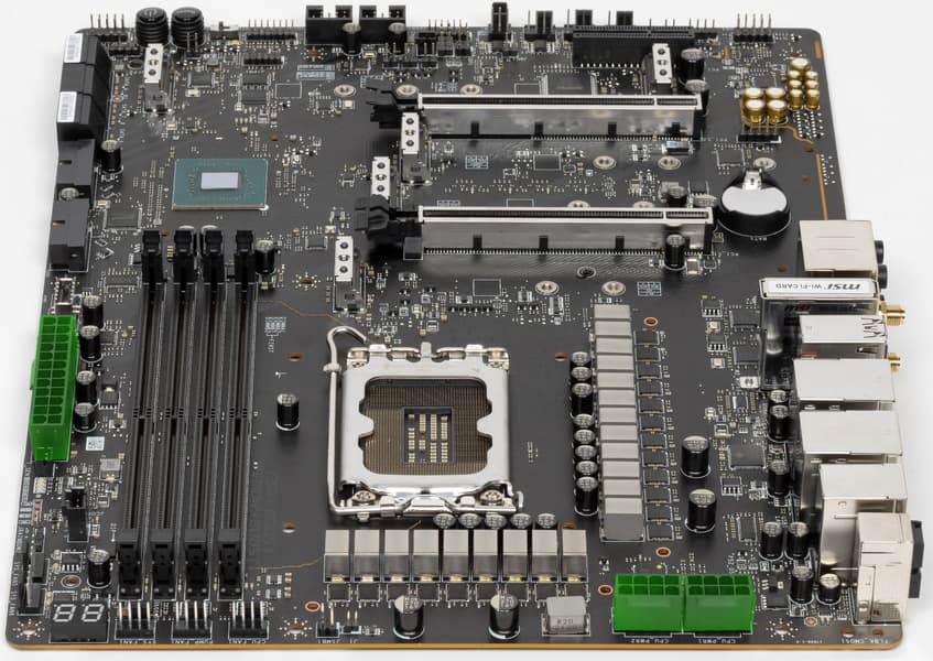 Матплата позволяет смонтировать СО любого размера. Для поддержания стабильных частот на шине PCIe имеются усилители (ре-драйверы) сигнала PCIe 4.0.