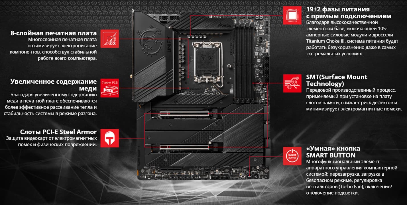 Материнская плата MSI MEG Z690 Unify — стильный представитель флагманской серии MEG с примерной стоимостью в районе 50 тысяч рублей. Конечно же, это дорого, но что поделать: и серия топовая, и платы на Z690 — изначально недешевый товар (хотя сравнительно бюджетные модели среди них все-таки есть).