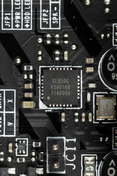 - 6 портов USB 2.0/1.1: 4 реализованы через контроллер Genesys Logic GL850G (на него потрачена 1 линия USB 2.0) и представлены двумя внутренними разъемами на материнской плате (каждый на 2 порта); еще 2 реализованы Z690 и представлены на задней панели 2 портами Type-A (черного цвета).