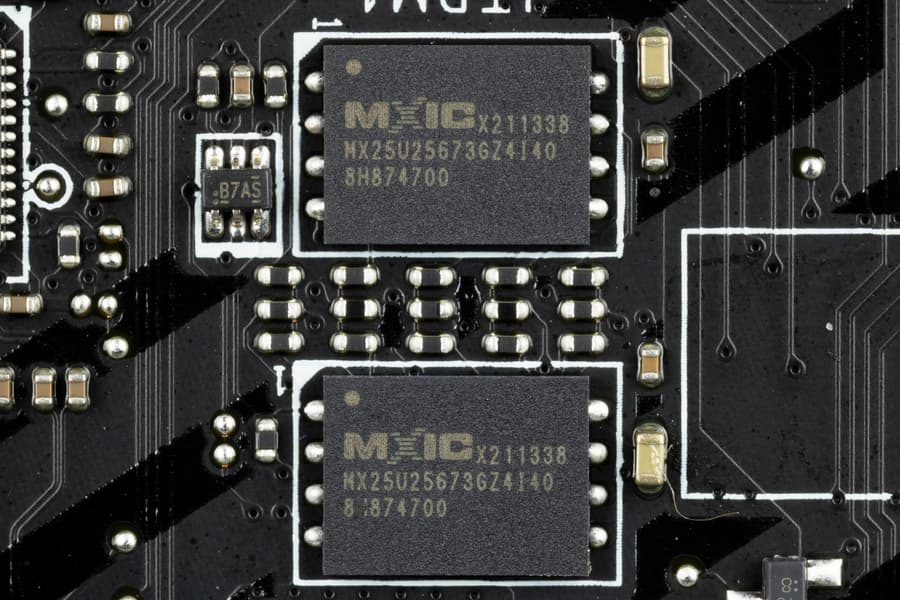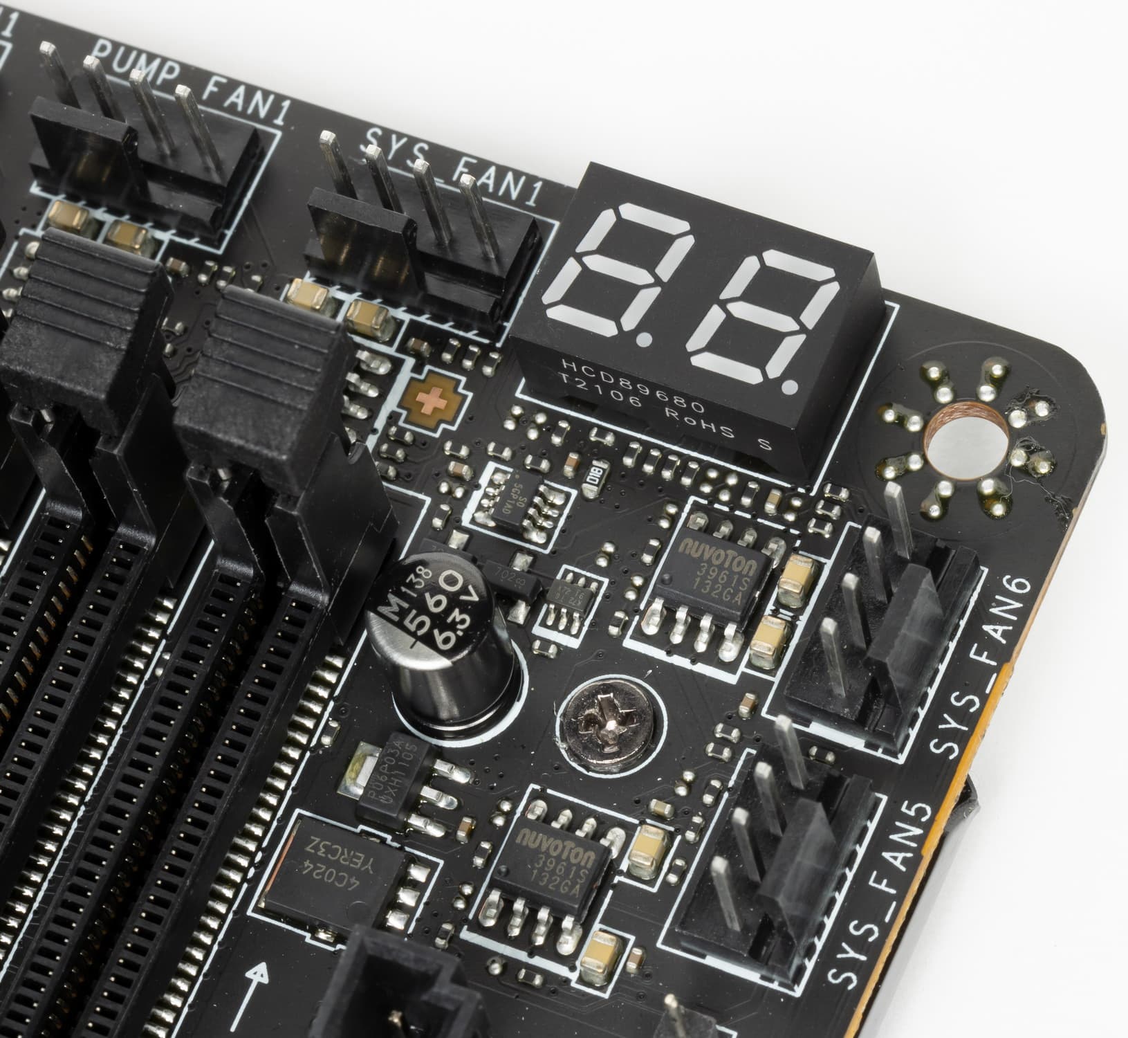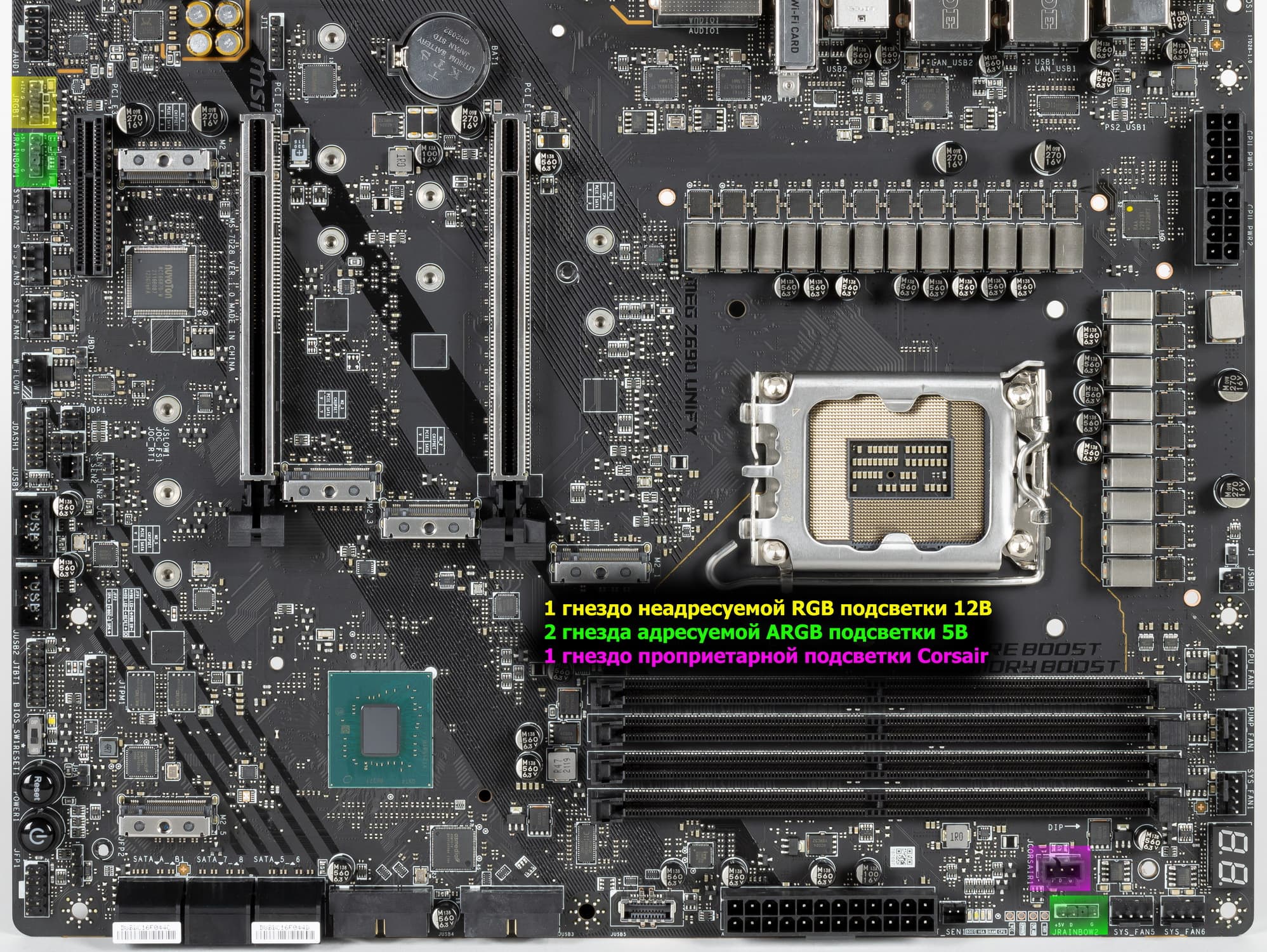 Еще у этой модели 6 портов SATA и 8 разъемов для вентиляторов. Полностью отвечая флагманскому позиционированию, плата имеет очень мощную систему питания, способную обеспечить работу любых совместимых процессоров с запасом на разгон (при этом очень грамотно выставлены параметры авторазгона, позволяющие сразу по умолчанию получить максимальное повышение частоты ядер процессора). Также мы видим очень грамотную систему охлаждения каждого потенциально греющегося элемента, включая накопители в слотах M.2. Сетевые возможности отменные: два быстрых проводных контроллера 2,5 Гбит/с, а также один самый современный беспроводной. В числе плюсов платы можно упомянуть широкие возможности для подключения ARGB/RGB-устройств.
