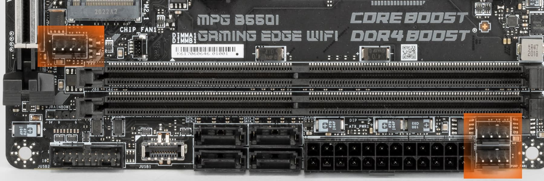 Слот M.2_1 расположен прямо над очень маленьким и плоским радиатором чипсета В550, накопитель в M.2_1 может и сам перегреваться, и дополнительно подогревать В550, поэтому для гарантии охлаждения сверху установлен радиатор с маленьким вентилятором. Детально об этом позже.