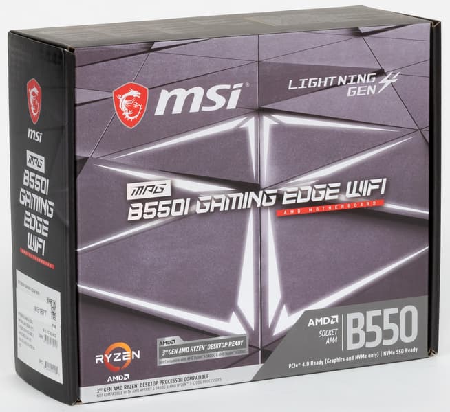 MSI MPG B550I Gaming Edge WiFi поставляется в небольшой, но толстой картонной коробке с фирменным дизайном MSI (дракон).