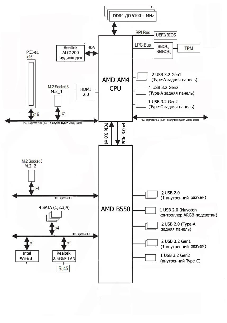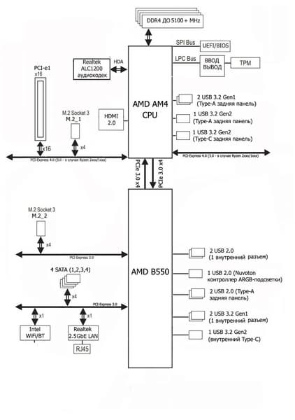 | Разъемы для накопителей | 4 × SATA 6 Гбит/с (B550) 1 × M.2 (CPU, PCIe 4.0/3.0 x4/SATA для устройств формата 2260/2280) 1 × M.2 (B550, PCIe 3.0 x4 для устройств формата 2280) |