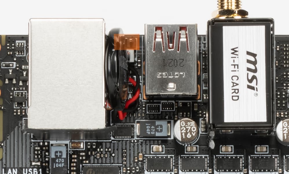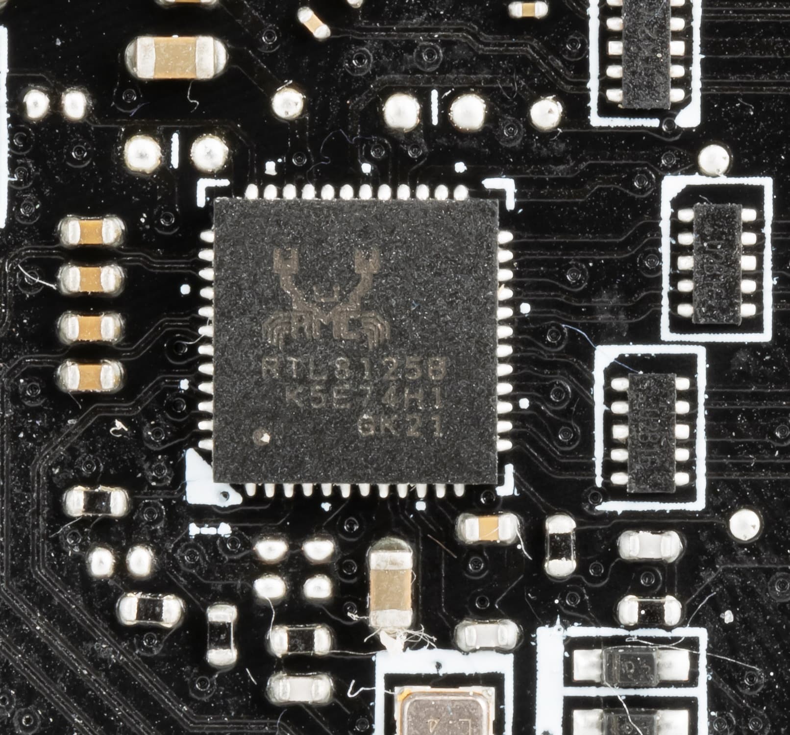 Материнская плата оснащена средствами связи скромно, но все равно 2 контроллера имеются. Один из них — скоростной Ethernet-контроллер Realtek RTL8125B, способный работать по стандарту 2,5 Гбит/с.