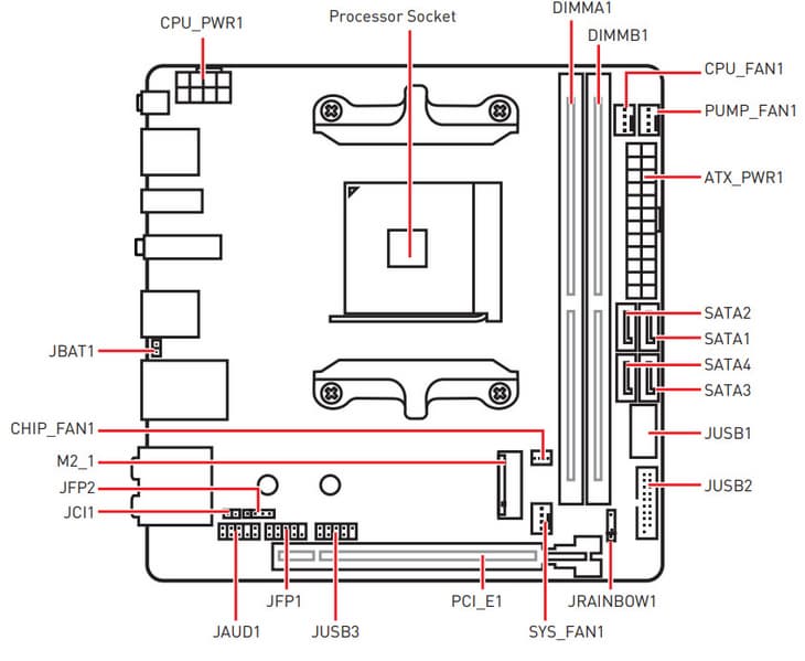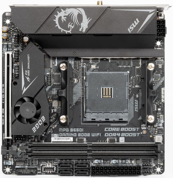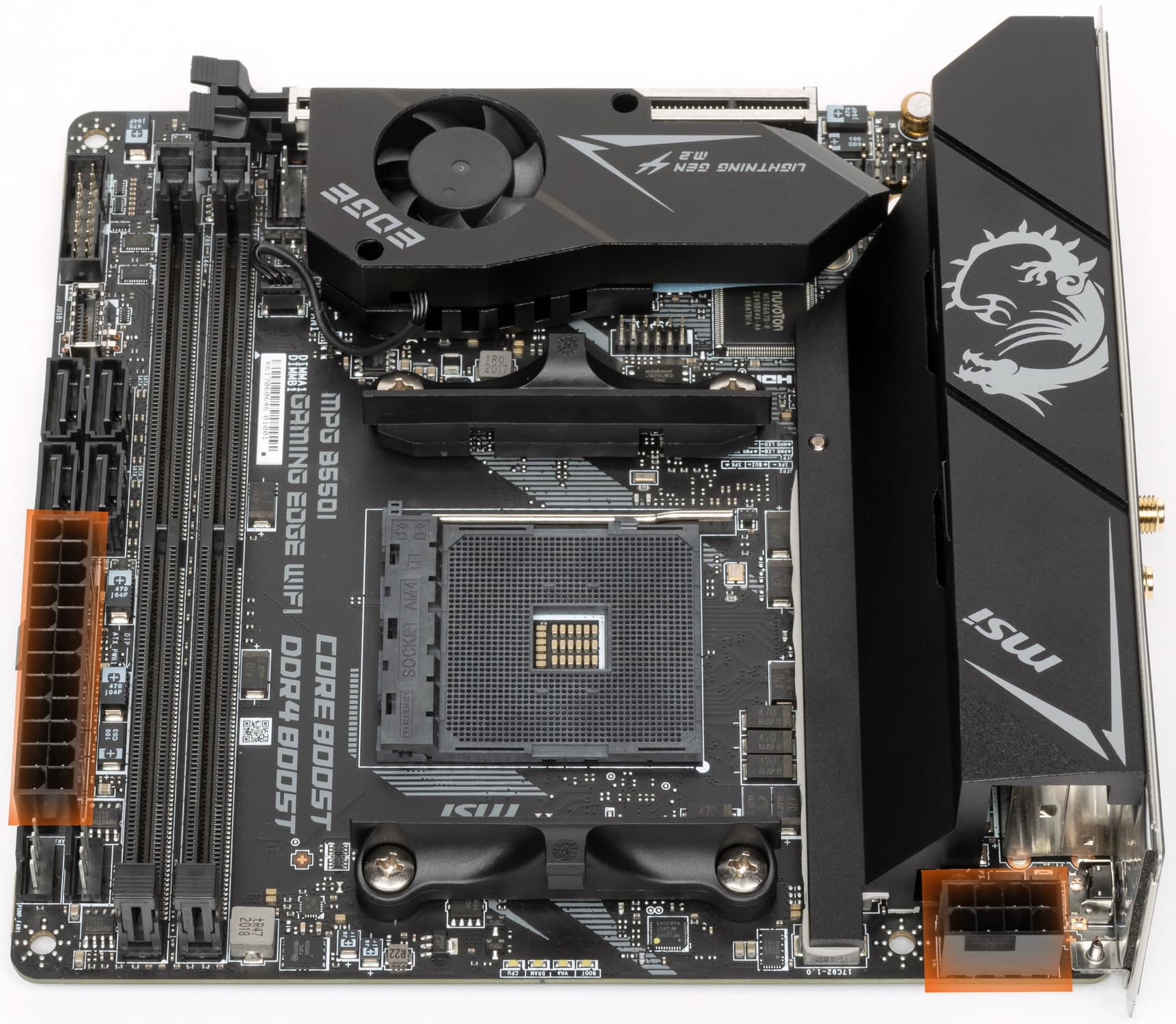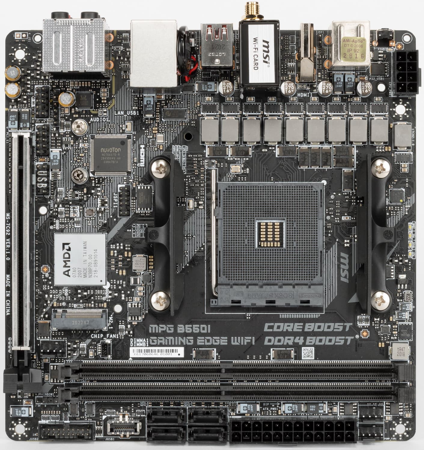 Форм-фактор Mini-ITX имеет размеры до 170×170 мм, материнская плата MSI MPG B550I Gaming Edge WiFi имеет точно такие размеры, поэтому полностью соответствует форм-фактору, и на ней имеются 4 монтажных отверстия для установки в корпус.