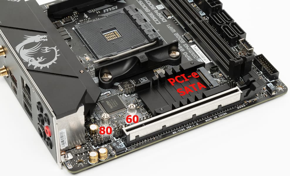 Первый слот M.2_1 расположен на лицевой стороне платы, поддерживает модули с любым интерфейсом (и размера до 2280 включительно), получая данные непосредственно от CPU, поэтому поддержка PCI-e 4.0 имеется.