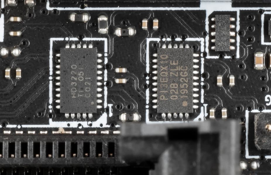 У данной платы распределения линий PCIe между слотами нет (ввиду наличия лишь одного), поэтому и мультиплексоров нет.
