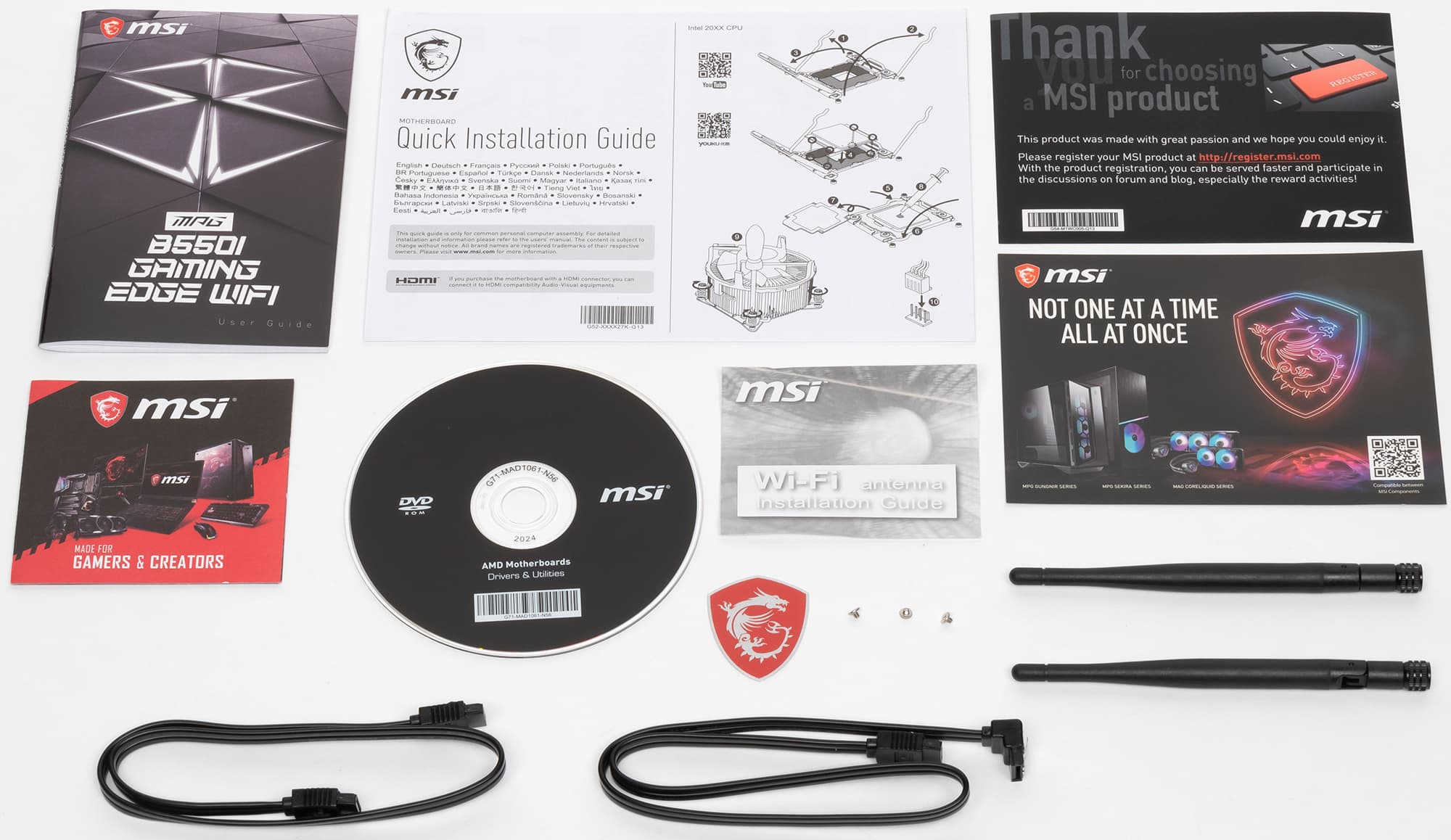 Комплект поставки банальный. Кроме традиционных элементов типа руководства пользователя и кабелей SATA, имеются: накопитель типа CD c ПО, винтики для M.2 накопителей, бумажки для участия во всяких программах от MSI, бонусная наклейка и антенны для беспроводного соединения.