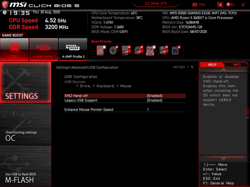 Для такого обновления BIOS версию прошивки надо вначале переименовать в MSI.ROM и записать в корень на USB-«флешку», которая вставляется в особо отмеченный порт USB. Ну и запуск через кнопку, которую надо держать 3 секунды. Материнская плата в процессе прошивания нового BIOS запускается, после успешного завершения (о чем демонстрирует погасший светодиод у кнопка Flash BIOS) выключается.