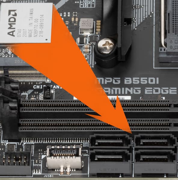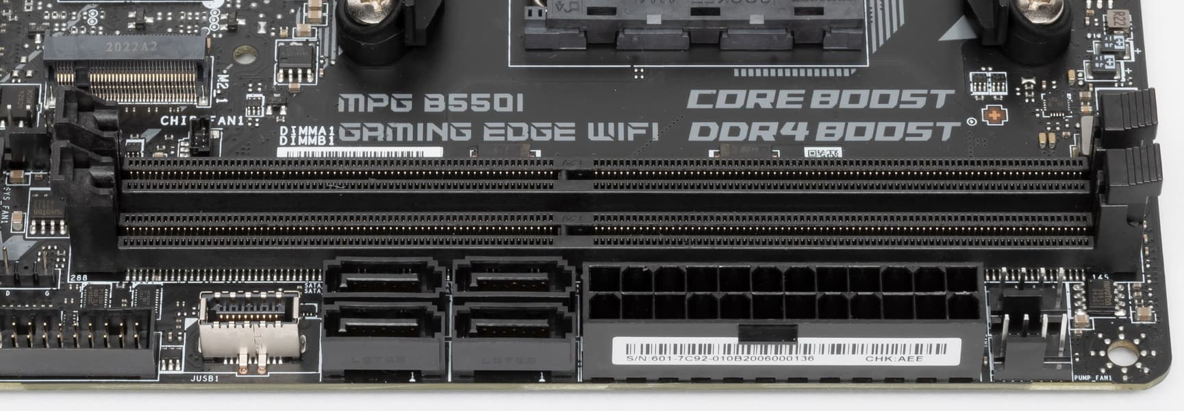 Всего у платы 4 разъема Serial ATA 6 Гбит/с + 2 слота для накопителей в форм-факторе M.2. 6 портов SATA реализованы через чипсет B550 и поддерживают создание RAID.