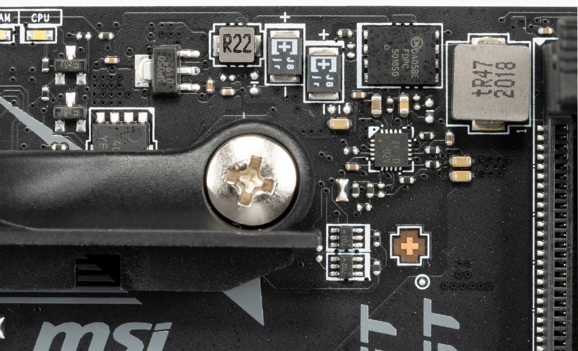 На оборотной стороне из элементов имеются: порт M.2, ряд контроллеров, усилителей сигнала и прочая мелкая логика. Обработан текстолит неплохо: во всех точках пайки острые концы срезаны. На месте блока VRM на оборотной стороне установлена дополнительная пластина для охлаждения