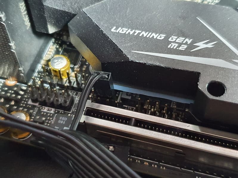 Следует отметить большие минусы в разводке. Во-первых, гнездо ARGB расположено очень близко к замку слота PCIe x16, и для того, чтобы его открыть для смены видеокарты, придется вытаскивать разъем подключенного устройства подсветки, и наоборот, чтобы подключить таковое, придется вытаскивать видеокарту.