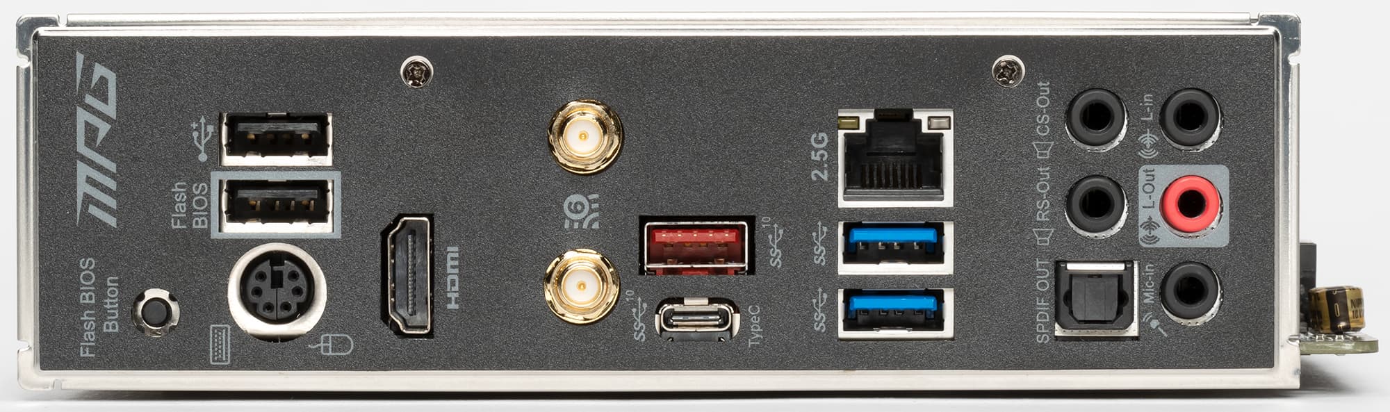 | Разъемы на задней панели | 1 × USB 3.2 Gen2 (Type-C) 1 × USB 3.2 Gen2 (Type-A) 2 × USB 3.2 Gen1 (Type-A) 2 × USB 2.0 (Type-A) 1 × RJ-45 5 аудиоразъемов типа миниджек 1 × S/PDIF (оптический аудиовыход) 1 × HDMI 2 антенных разъема 1 × PS/2 комбинированный разъем 1 кнопка перепрошивки BIOS — Flash BIOS |