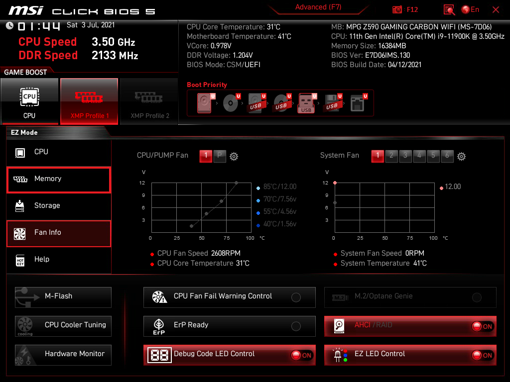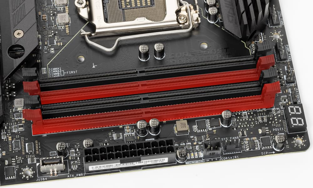 Для установки модулей памяти на плате MSI имеется четыре DIMM-слота (для работы памяти в Dual Channel в случае использования всего 2 модулей их следует устанавливать в А2 и B2. Плата поддерживает небуферизованную память DDR4 (non-EСС), а максимальный объем памяти составляет 128 ГБ (при использовании UDIMM последнего поколения по 32 ГБ). Разумеется, поддерживаются профили XMP.