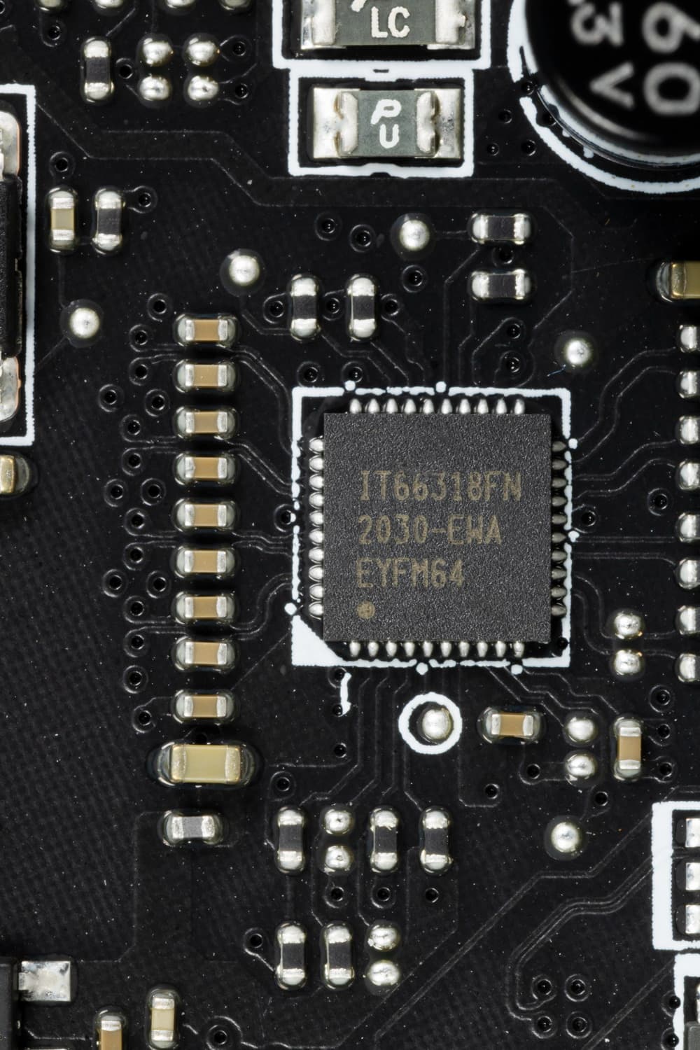 - HDMI 2.0b, однако если графика в 11м поколении процессоров Intel основана на новой архитектуре и имеет встроенную поддержку версии HDMI 2.0b, то в 10м поколении — интегрирована поддержка лишь версии 1.4. Поэтому для конвертации (усиления, так сказать) версии до 2.0b имеется особый контроллер IT66318 (ITE).