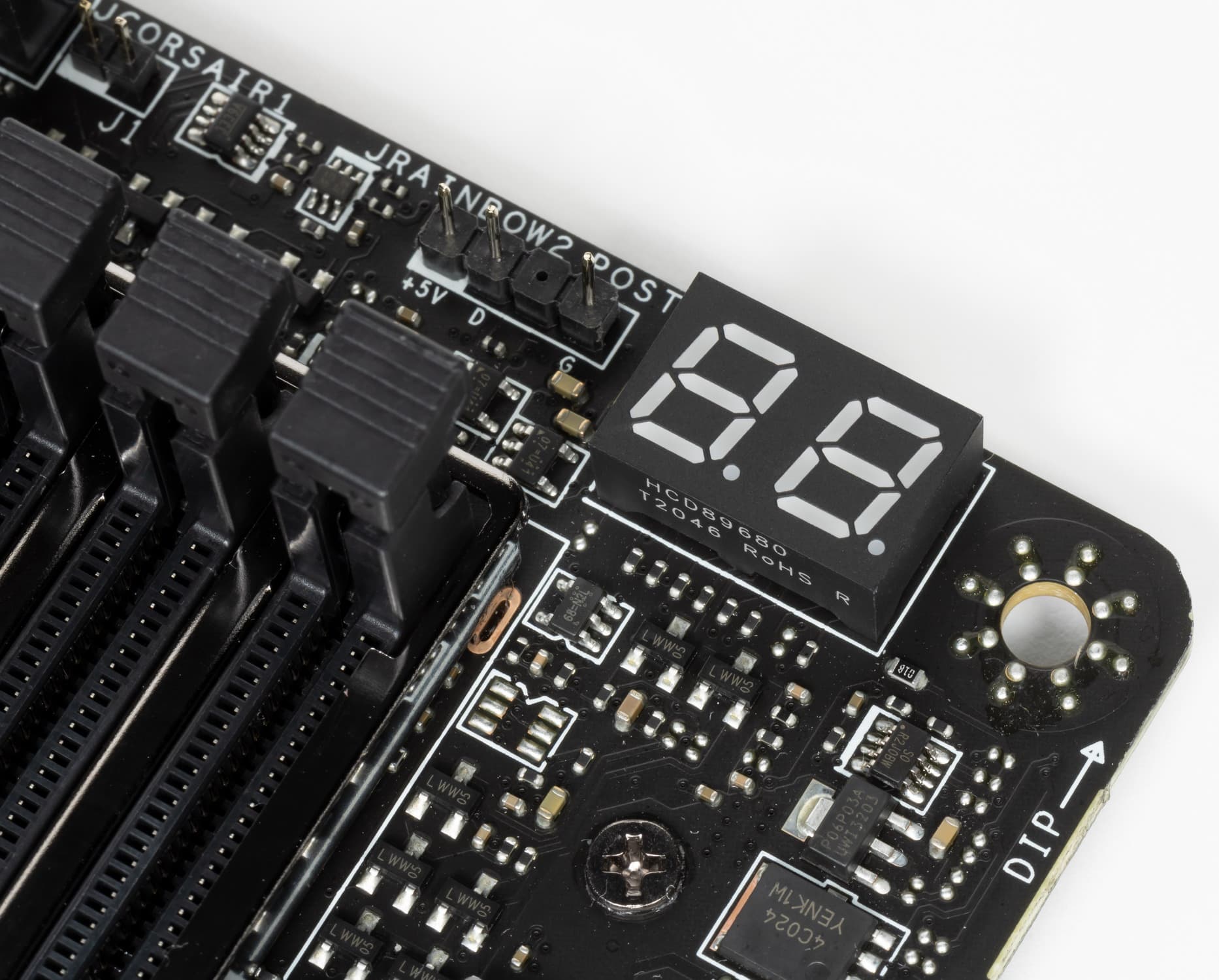 Для питания платы на ней предусмотрены 4 разъема: в дополнение к 24-контактному ATX (он на правой стороне платы (на фото — слева) здесь есть еще два 8-контактных EPS12V и один 6-контактный PCIe для стабильного питания мультиграфической системы.