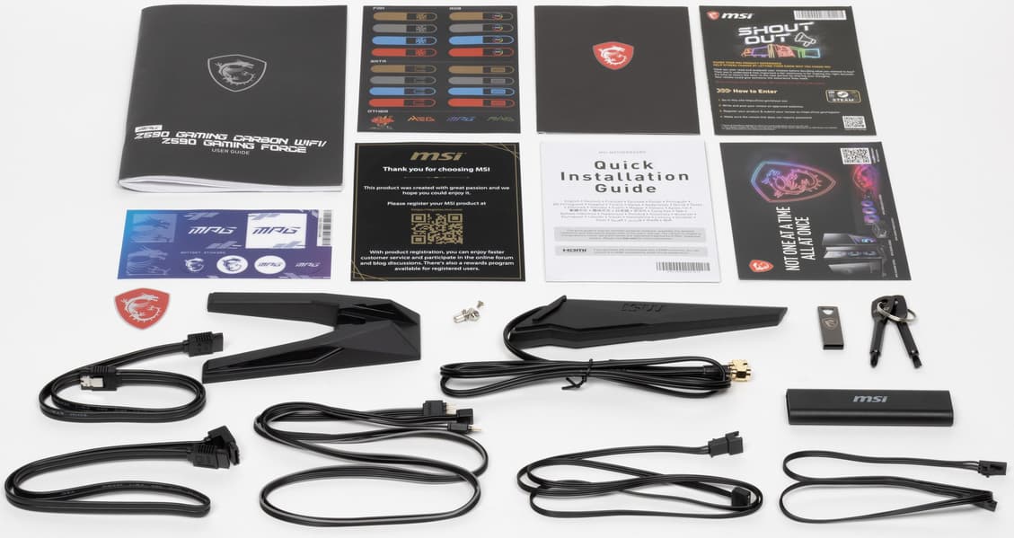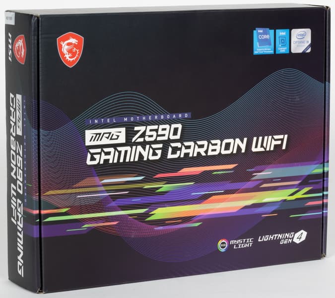 MSI MPG Z590 Gaming Carbon WiFi поставляется в стандартной коробке фирменного дизайна серии MPG. Комплект размещен под платой в отдельном отсеке (только лишь антенна беспроводной связи закреплена над материнкой).