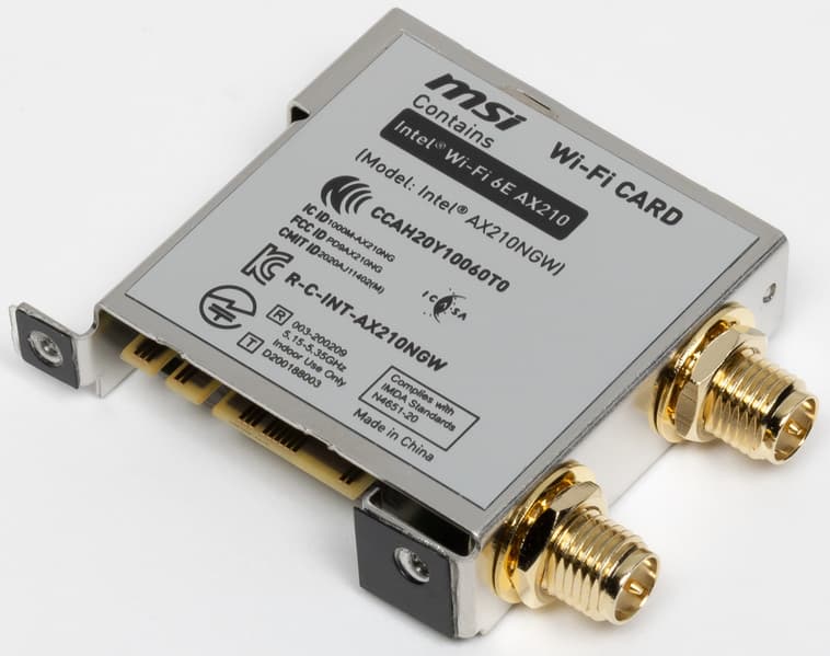 Имеется и комплексный беспроводной адаптер на контроллере Intel AX-210NGW, через который реализованы Wi-Fi 6E (802.11a/b/g/n/ac/ax) и Bluetooth 5.2. Он установлен в слот M.2 (E-key), и его разъемы для привинчивания выносных антенн выведены на заднюю панель.