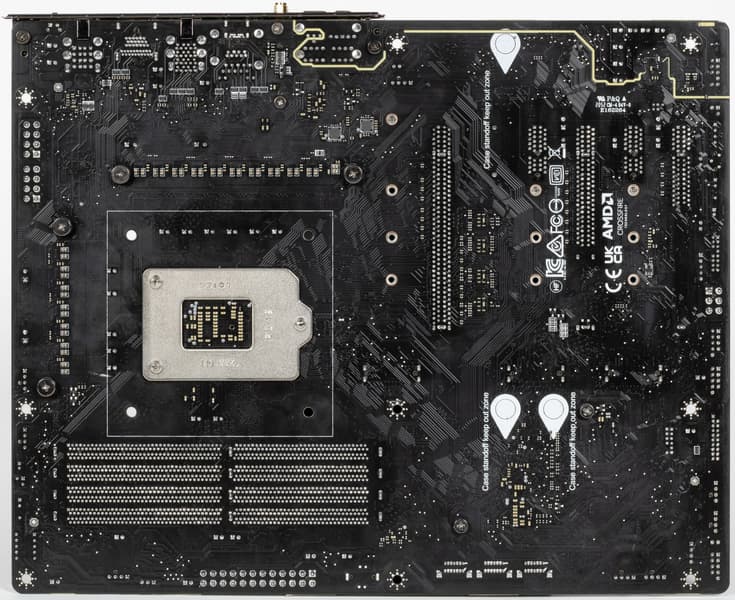 Однако это не все. По традиции у всех плат от MSI на оборотной стороне обозначены места, где могут оставаться ненужные в данный момент крепежные втулки (чаще всего латунные), на которые обычно ложится матплата в корпусе, и к которым ее прикручивают. Эти места отмечены белой краской, и нарочно в них нет никаких электропроводных элементов, чтобы в случае установки матплаты не было случайных замыканий или повреждений от лишней крепежной втулки.