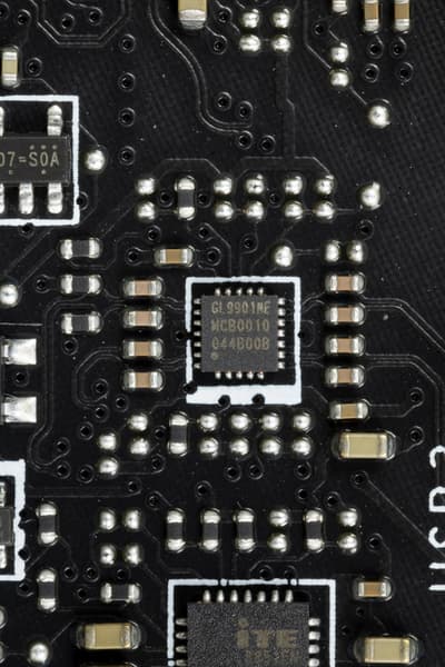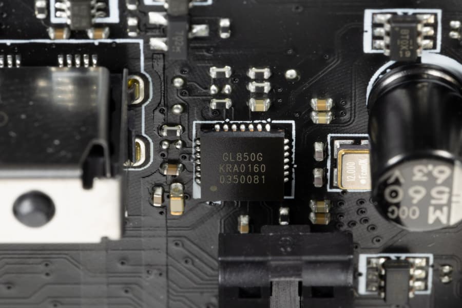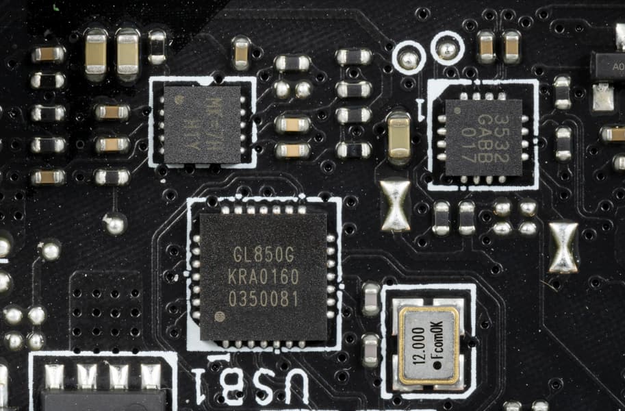 - 8 портов USB 2.0/1.1: 4 реализованы через контроллер Genesys Logic GL850G (на него потрачена 1 линия USB 2.0) и представлены двумя внутренними разъемами (каждый на 2 порта), еще 4 реализованы через второй контроллер Genesys Logic GL850G (на него потрачена 1 линия USB 2.0) и представлены на задней панели портами Type-A (черного цвета).