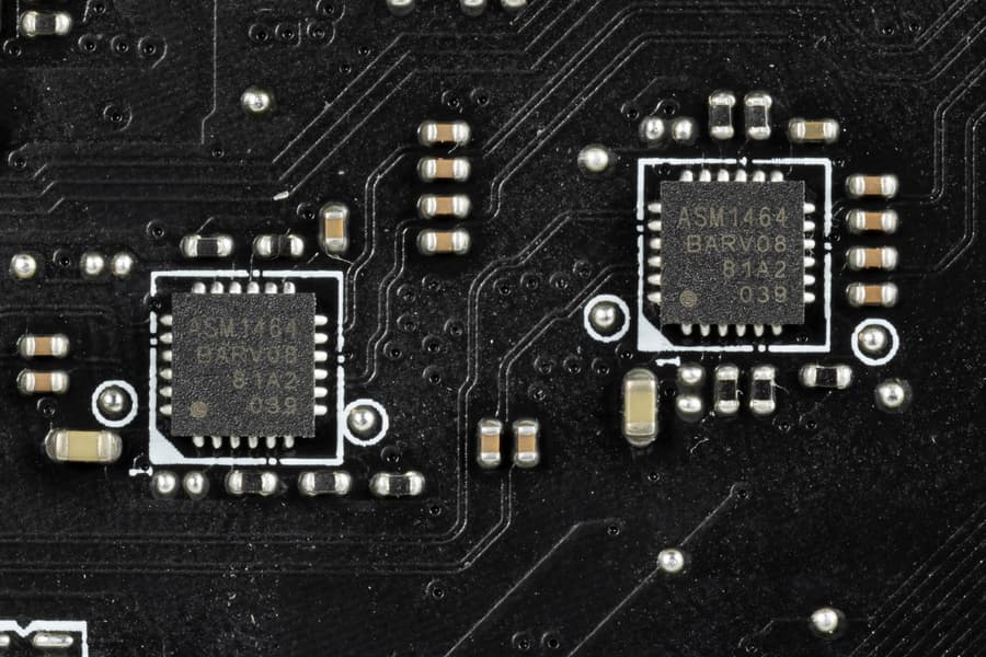 Для обеспечения переключений между М.2 и SATA портами имеются мультиплексоры ASM1480 от ASMedia.