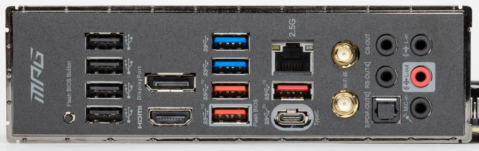 | Разъемы на задней панели | 1 × USB 3.2 Gen2 (Type-C) 3 × USB 3.2 Gen2 (Type-A) 2 × USB 3.2 Gen1 (Type-A) 4 × USB 2.0 (Type-A) 1 × RJ-45 5 аудиоразъемов типа миниджек 1 × S/PDIF (оптический, выход) 1 × HDMI 2.0b 1 × Display Port 1.4 2 антенных разъема кнопка перепрошивки BIOS — Flash BIOS |