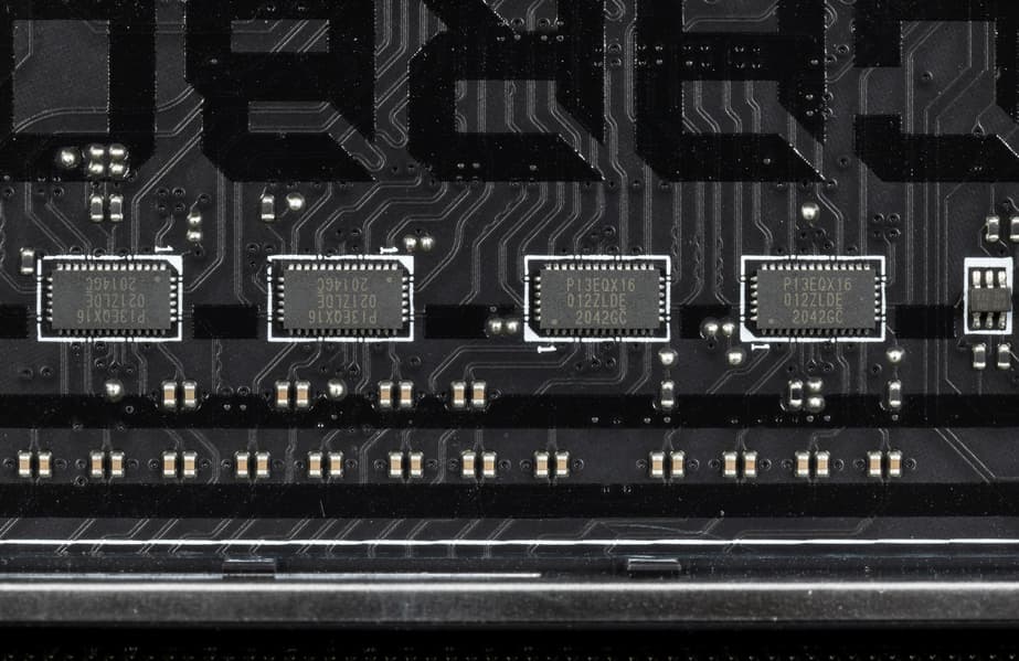 Как видим, перераспределение линий PCIe между слотами у этой материнки имеется, поэтому востребованы мультиплексоры PI3EQX16 от Diodes Inc. (ex Pericom).