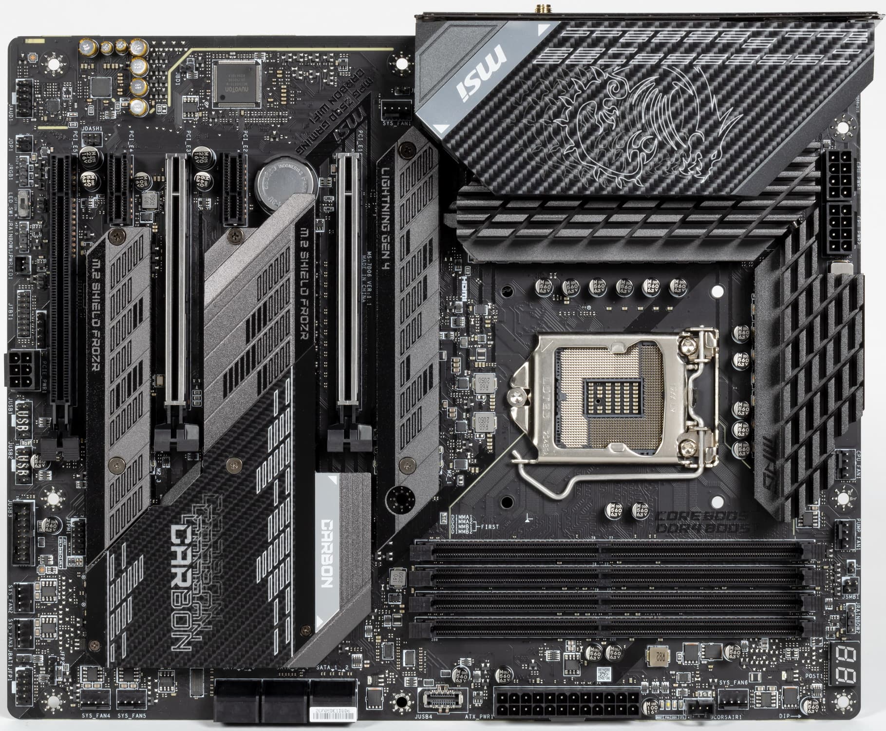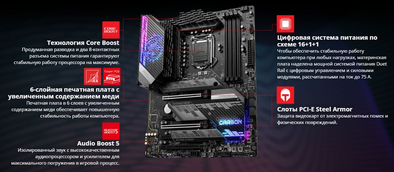 MSI MPG Z590 Gaming Carbon WiFi — отличный компромиссный вариант между дорогими флагманскими игровыми моделями и бюджетными решениями (если так вообще можно назвать платы на топовом чипсете Intel Z590).