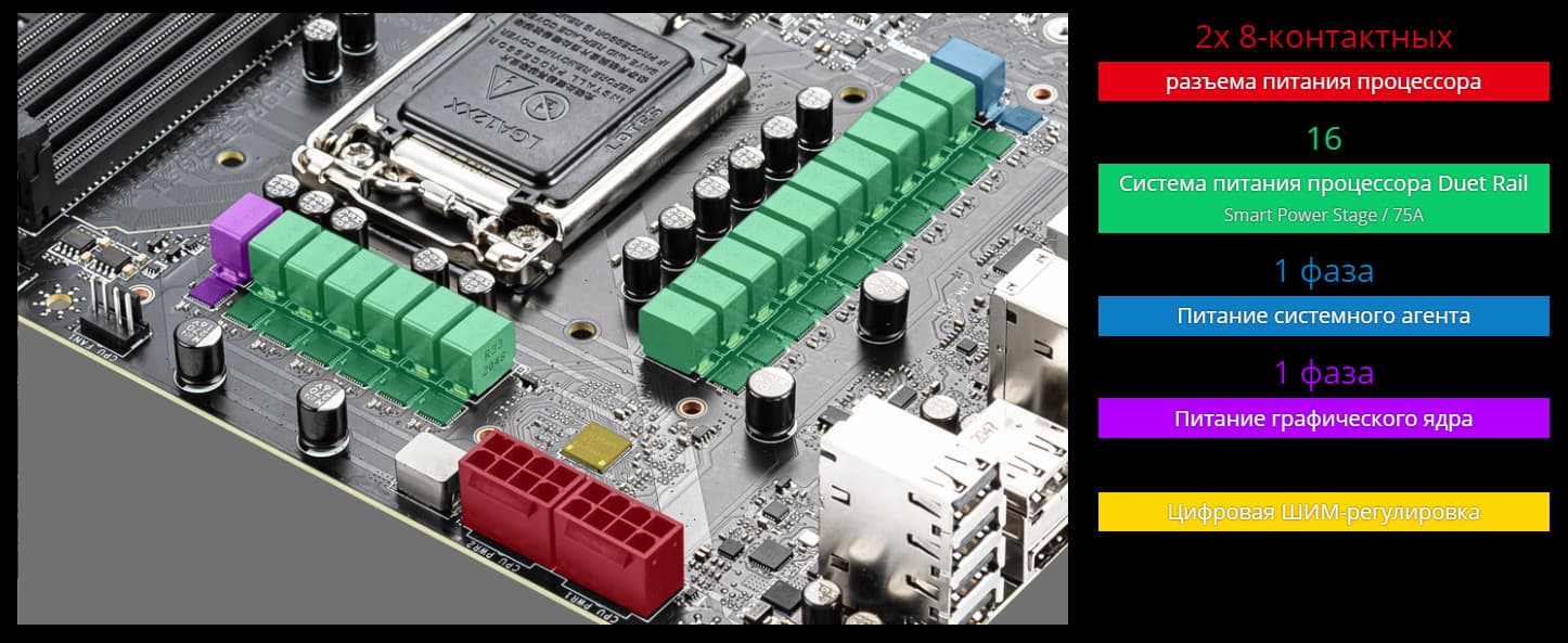 Схема питания процессора выполнена по схеме 16+1+1 (всего 18 фаз, 16 на VCore, 1 на iGPU и 1 на VCCSA).