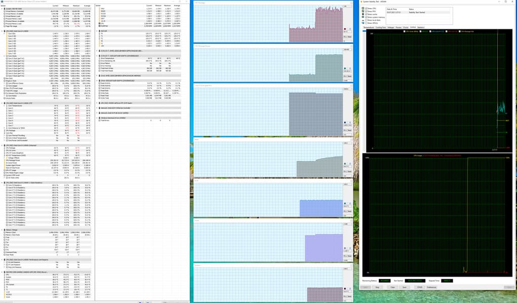 Ну и частоты по ядрам уже начали прыгать сильно вниз. И надо заметить, что у нас весьма мощная СЖО, три вентилятора на 360мм радиаторе пахали на максимумах — выше 2200 оборотов в минуту, тем не менее... А ведь совсем недавно 10900К даже на 5.1 ГГц по 10 ядрам пахал и даже не думал так перегреваться. Мне до сих пор непонятен выпуск 11-го поколения в этом плане. Да, 20 линий PCIe, а не 16. Да, PCIe 4.0, а не 3.0. Но при этом даже 4.8 ГГц по 8-ми (а не 10ти!) ядрам подчас не получить на нормальных СЖО. И я удивляюсь позиции многих производителей матплат, которые секрет успеха авторазгона видят в задирании напряжения ядер процессора.
