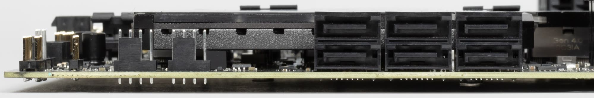 Всего у платы 6 разъемов Serial ATA 6 Гбит/с + 3 слота для накопителей в форм-факторе M.2. Все порты SATA реализованы через чипсет Z590 и поддерживают создание RAID.
