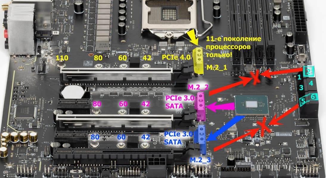 Так же M2_3 взаимоисключает совместную работу с портами SATA_5 и SATA_6. И только верхний M2_1 не делит ресурсы ни с чем.