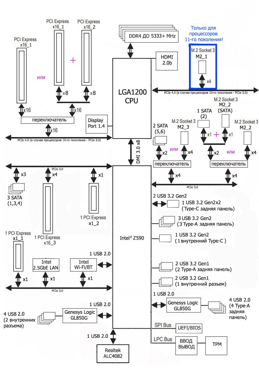 Процессоры Intel Core 11-го поколения (совместимые с сокетом LGA1200 и поддерживаемые Z590) имеют 20 линий ввода-вывода PCIe 4.0, не имеют USB и SATA портов. При этом взаимодействие с Z590 идет по особому каналу Digital Media Interface 3.0 (DMI 3.0), который в Z590 ускорен в 2 раза. Все PCIe линии процессора идут на слоты расширения PCIe и порт М.2. Serial Peripheral Interface (SPI) используется для взаимодействия с системой UEFI/BIOS, а шина Low Pin Count (LPC) — для связи с устройствами ввода/вывода, не требующими высокой пропускной способности (контроллерами вентиляторов, TPM, старой периферии). Процессоры Intel Core 10-го поколения (совместимые с сокетом LGA1200 и поддерживаемые Z490/590) имеют 16 линий ввода-вывода PCIe 3.0, которые идут только на слоты расширения PCIe.