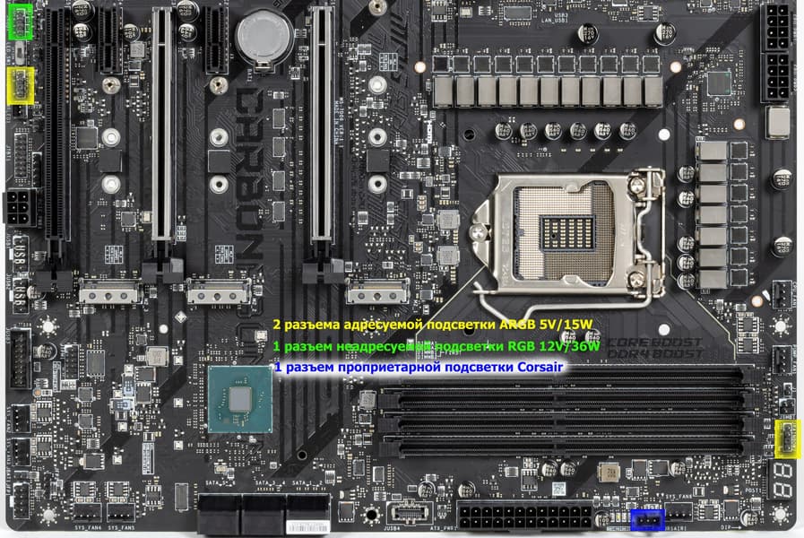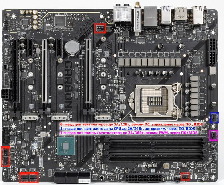 Теперь про блок ввода-вывода, разъемы для подключения вентиляторов и т. п. Разъемов для подключения вентиляторов и помп на самой плате — 8. Схема размещения коннекторов для систем охлаждения выглядит так: