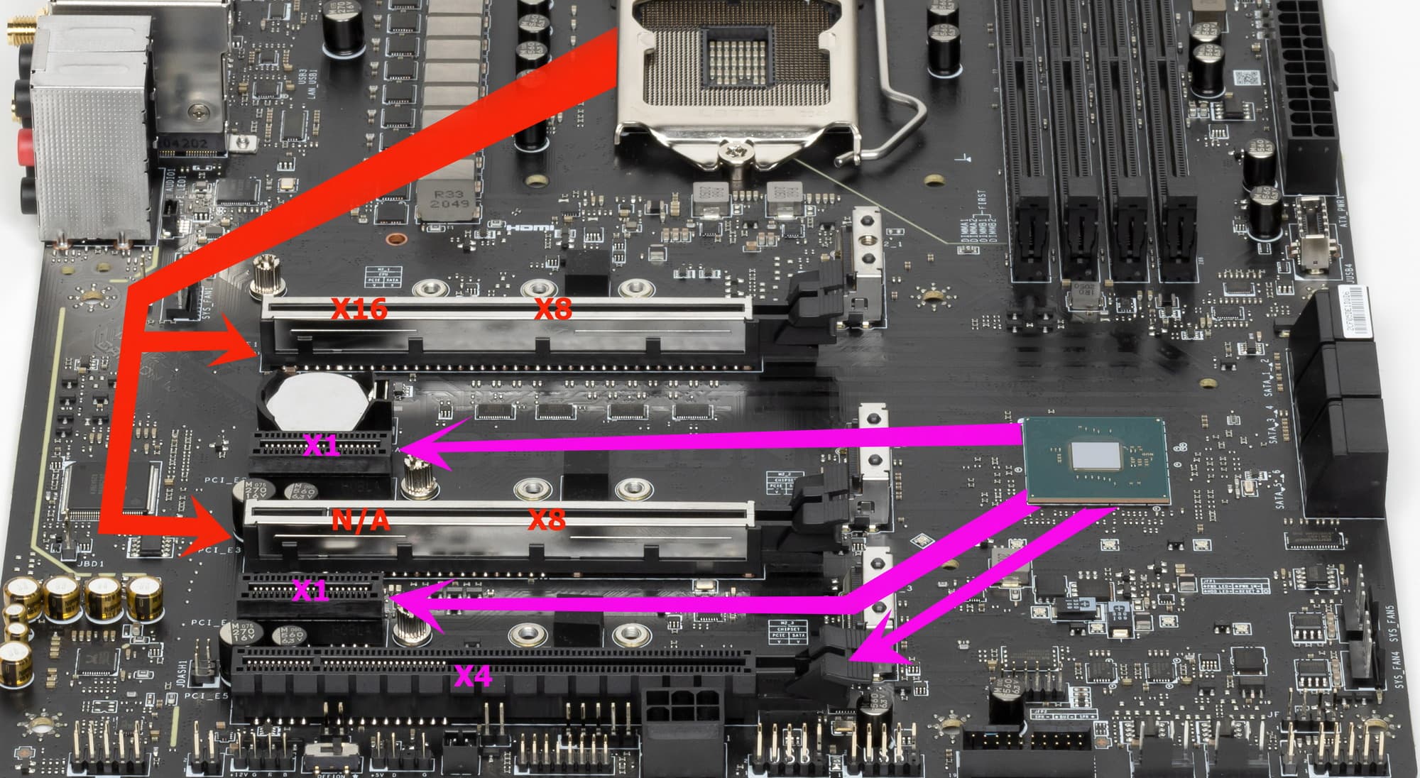 Теперь посмотрим выше на то, как работают процессоры в данной конфигурации. У CPU 11-го поколения всего 20 линий PCIe, 4 из них отведены на порт М.2. У CPU 10-го поколения всего 16 линий (нет выделения линий на М.2 порт). Оставшиеся 16 линий надо делить на два слота PCIe x16 (_1 и _2). Вариантов переключения несколько: