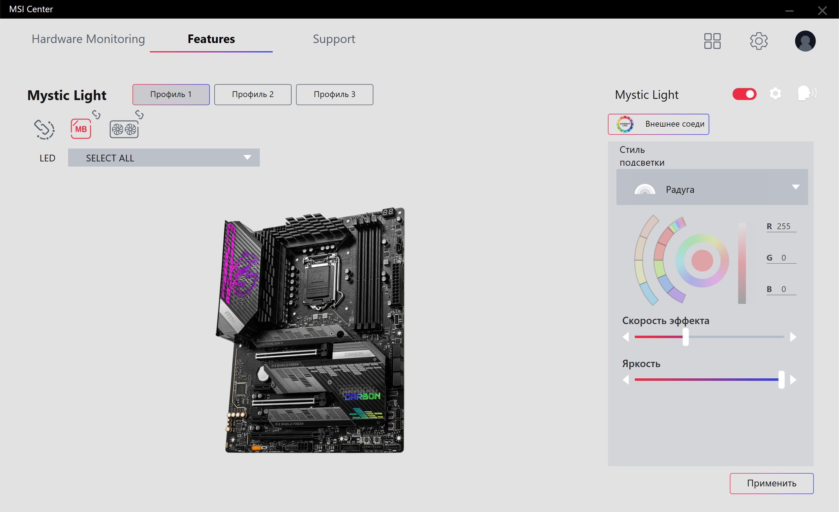 Формально имеется поддержка памяти до 3200 МГц, однако всем хорошо известно, и производители материнских плат это активно рекламируют: через XMP-профили сейчас можно использовать частоты до 4800 и выше МГц. В частности данная плата поддерживает частоты до 5333+ МГц.