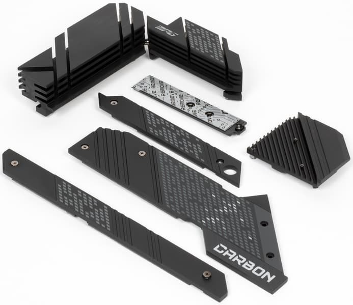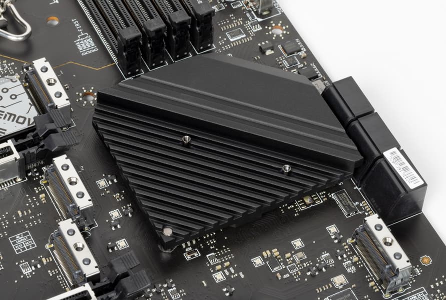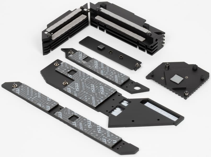 Все M.2 слоты имеют радиаторы. Верхний M.2_1 обладает отдельным радиатором, когда как остальные слоты M.2 имеют общие радиаторы (у М.2_2 и М.2_3 общий радиатор с чипсетом).