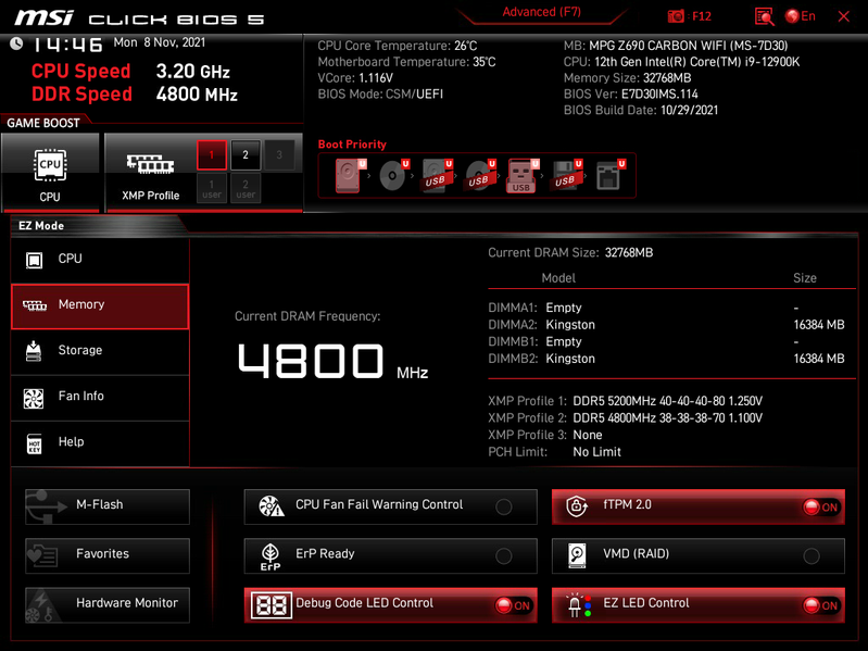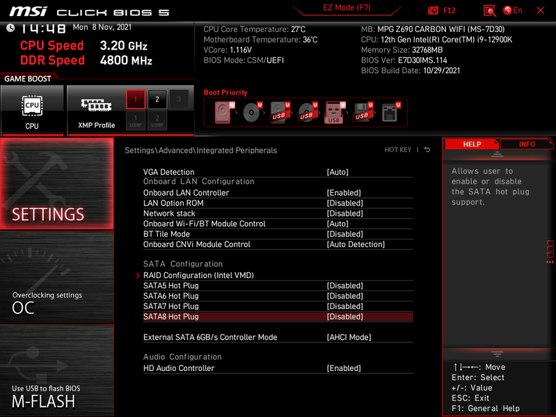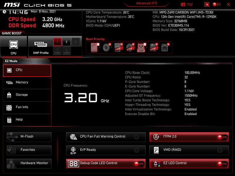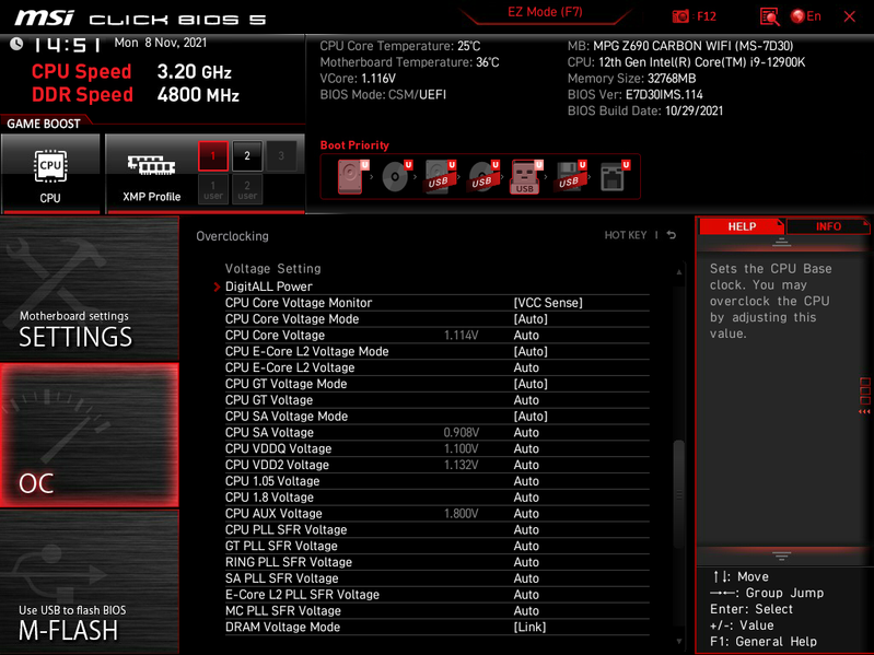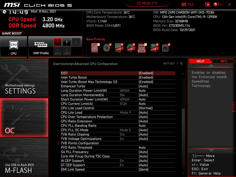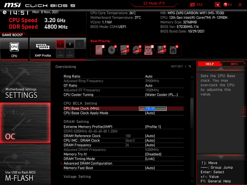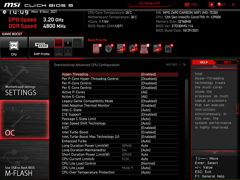 Разумеется, MSI MPG Z690 Carbon WiFi предлагает широкие возможности для любителей разгона в виде множества настроек в BIOS Setup и фирменных утилитах — лишь бы кулер справлялся.