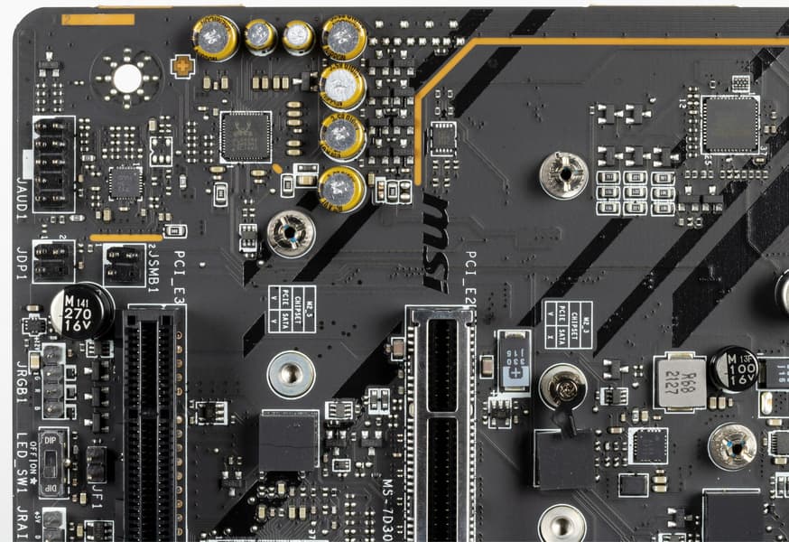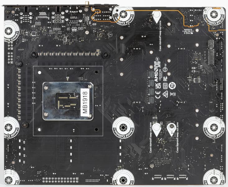Однако это не все. По традиции у всех плат от MSI на оборотной стороне обозначены места, где могут оставаться ненужные в данный момент крепежные втулки (чаще всего латунные), на которые обычно ложится матплата в корпусе, и к которым ее прикручивают. Эти места отмечены белой краской, и нарочно в них нет никаких электропроводных элементов, чтобы в случае установки матплаты не было случайных замыканий или повреждений от лишней крепежной втулки.