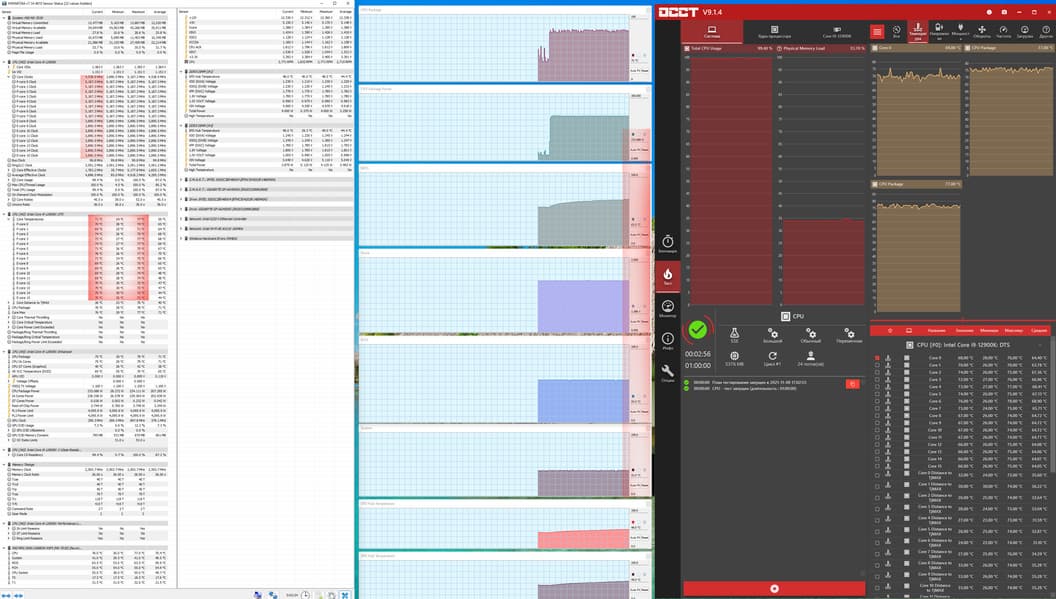 Во!! Получилось! Помнится, что с предыдущей «водянкой» тот же процессор даже на более флагманских матплатах почти не давал выходить на 5.2 ГГц по всем Р-ядрам, тут же появлялся троттлинг. А здесь, хоть минут через 15 и появился перегрев и троттлинг, но все же это 5200 МГц!!! Все остальные параметры работы в норме.
