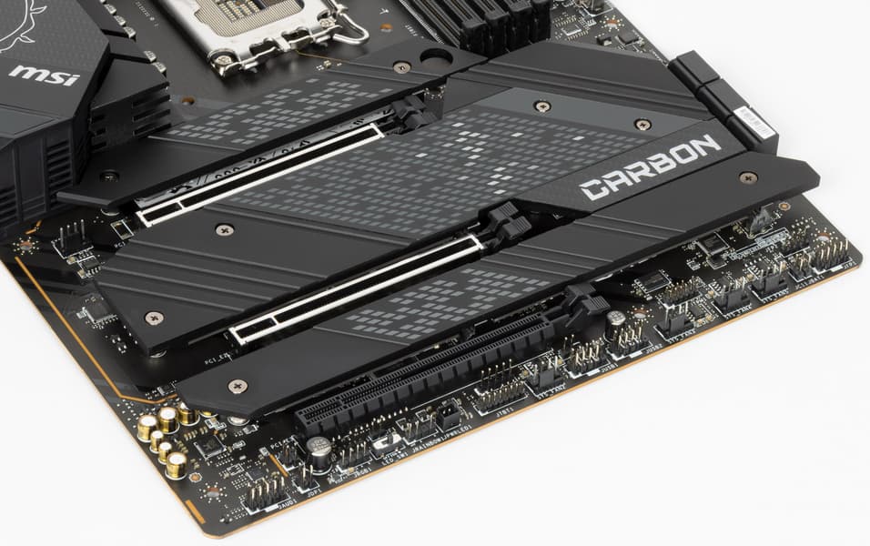 Всего на плате есть 3 слота: два PCIe x16 (для видеокарт или других устройств) и один PCIe x16 (но фактически имеющий 4 линии). Если про первые два PCIe x16 я выше уже рассказал (они подключены к CPU), то PCIe x16_3 подключен к Z690 и работающий в режиме х4.