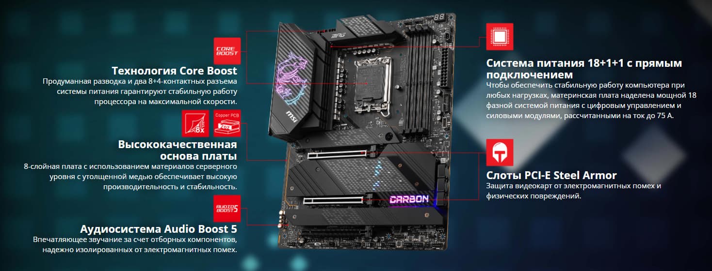 Герой нынешнего обзора — MSI MPG Z690 Carbon WiFi. То есть материнка из семейства MPG (MSI Performance Gaming), которая не относится к топовым (все флагманы — в семействе MEG), однако являет собой все равно очень мощный инструмент для современного ПК, обладая всеми широкими возможностями как по набору периферии, так и по возможностям питания.